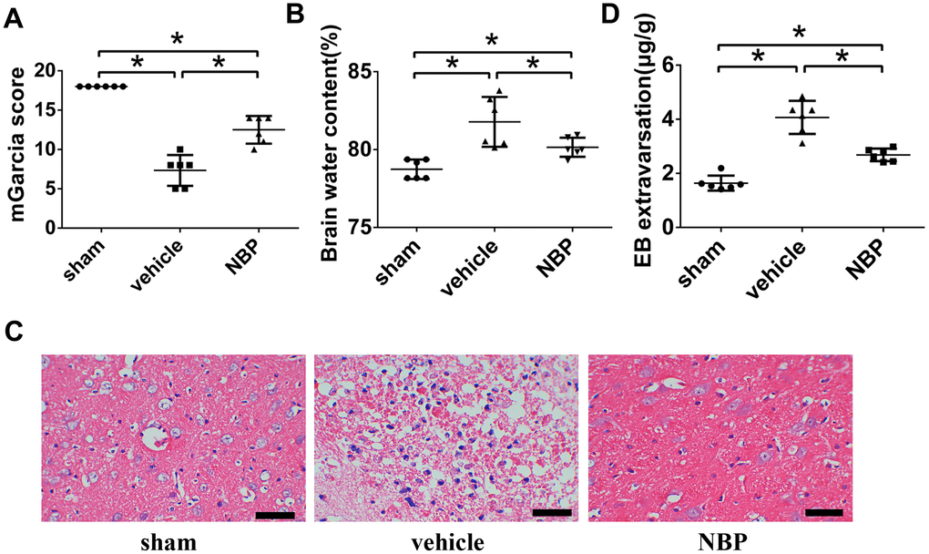 One of the consequences of ICH is impaired neurological function. In order to examine the therapeutic effects of NBP after ICH, we first performed the neurological deficit assay using mGarcia neurological scoring system, which has been widely used to investigate early pathophysiological changes. In this scoring system, the more severe the neurological damage, the lower the mGarcia score obtained. At 48h postoperatively, the sham group performed normally according to the modified Garcia score. The rats in vehicle group and NBP group showed a phenomenon of hemiplegia to the left after ICH operation. Although the mGarcia score for vehicle/NBP group were significantly lower than the sham group (P<0.05), which means a significant neurological deficit after ICH, the NBP group’s rats gained a significantly higher mGarcia score than vehicle group (P < 0.05; Figure 1A). These results suggest that NBP treatment can improve and rescue the neurological function after ICH injury effectively.