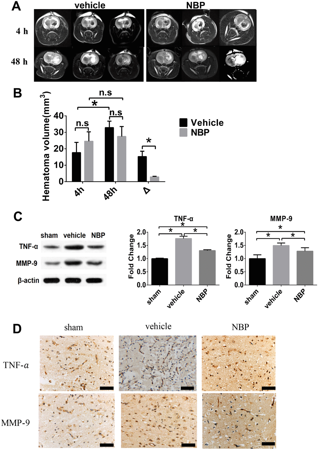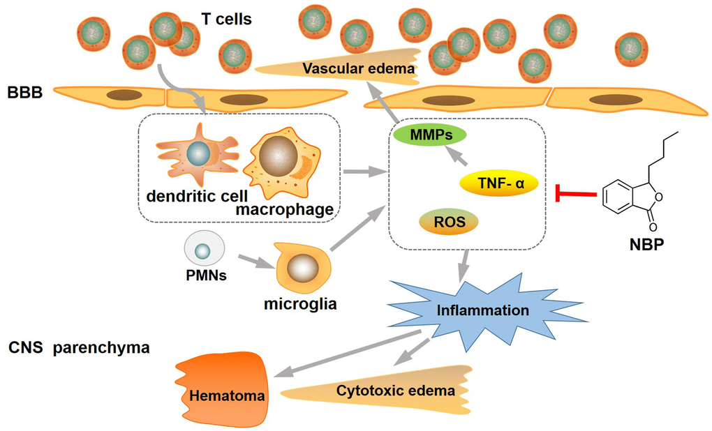 In summary, our results demonstrate that NBP inhibits the expression of TNF-α and MMP-9, thereby reducing inflammatory reactions, BBB damage, the ICH-induced injured area, and both cytotoxic and vasogenic edema. Our findings provide evidence for the treatment of intracerebral hemorrhage and the clinical application of NBP.