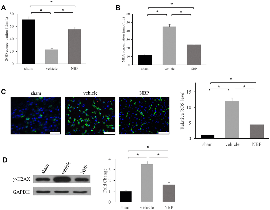 Oxidative stress has been considered to be closely linked with inflammation, so we investigated the influence of NBP on super oxide dismutase (SOD), malondialdehyde (MDA), reactive oxygen species (ROS) levels. We found that in the group vehicle SOD (Figure 3A) was decreased, but MDA (Figure 3B) and ROS (Figure 3C) increased significantly. However, NBP treatment remarkably reversed these trends and inhibited oxidative stress. Meanwhile, DNA damage marker, γ-H2AX, was measured after NBP treatment. We found that NBP remarkably suppressed the level of γ-H2AX suggesting that NBP could inhibit DNA damage (Figure 3D).