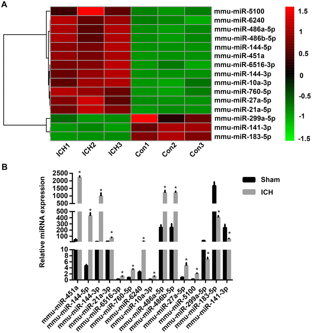 Low-molecular-weight RNA was isolated from the brains of mice in the ICH 3-day and sham groups using the mirVana RNA Isolation Kit (Thermo Fisher Scientific Inc., Waltham, MA, USA). MiRNA expression profiles were determined with the Illumina HiSeq 4000 platform (Illumina, Inc., San Diego, CA, USA) according to the manufacturer’s instructions. The sequencing process was supported by Annoroad Gene Technology Co., Ltd. (Beijing, China).