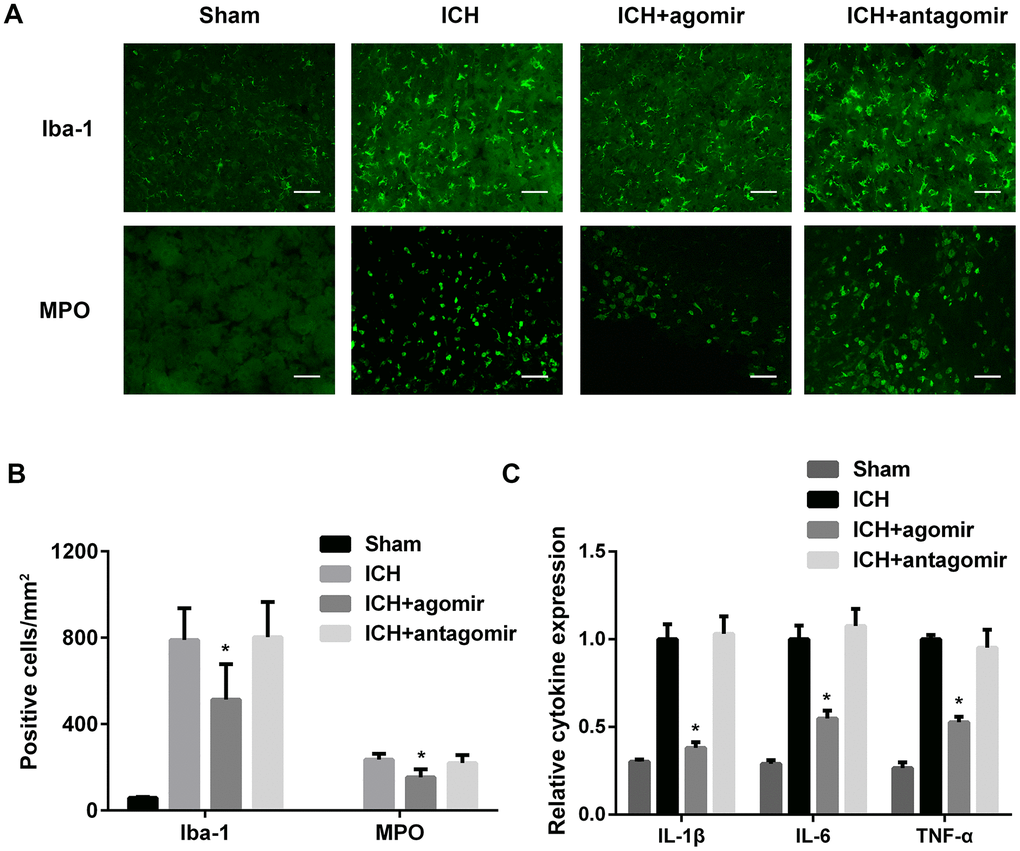 To determine the effect of miR-183-5p on microglia activation and leukocyte infiltration after ICH, we performed an immunofluorescence experiment. We found that the number of activated microglia in the perihematomal area was lower in the agomir group (P < 0.05), but not the antagomir group (P > 0.05), when compared to the control group (Figure 3A and 3B). In addition, the number of MPO-positive neutrophils in the hemorrhagic striatum was significantly lower in the agomir group compared with the control group (Figure 3A and 3B).