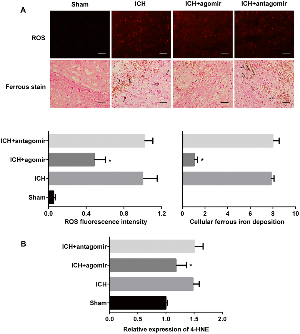 We next determined whether miRNA-183-5p is involved in the regulation of reactive oxygen species (ROS) and the production of divalent iron. The fluorescent indicator hydroethidine was used to examine ROS production in situ (Figure 4A and Supplementary Figure 3A). In vivo, the fluorescence intensity of hydroethidine was significantly lower in the agomir group (P < 0.05) but nearly unchanged in the antagomir group (P > 0.05). The results of Lillie staining to determine ferrous deposition also showed that there were fewer positive cells in the agomir group (P < 0.05) (Figure 4A) but that there was no difference in positive cells between the ICH and antagomir groups (P > 0.05). Interestingly, the amount of ROS produced by individual BV2 microglia in vitro did not change significantly, but the number of viable microglia was significantly reduced (Supplementary Figure 3A). This finding was consistent with the trends observed in vivo, as shown by the miRNA-183-5p–mediated reduction in ROS production (Supplementary Figure 3B). The lipid peroxidation product, 4-HNE, was assessed by ELISA. The in vivo (Figure 4B) and in vitro (Supplementary Figure 3C) results showed that miRNA agomir treatment decreased the 4-HNE protein level (P < 0.05), whereas antagomir treatment did not notably change the expression of 4-HNE (P > 0.05).