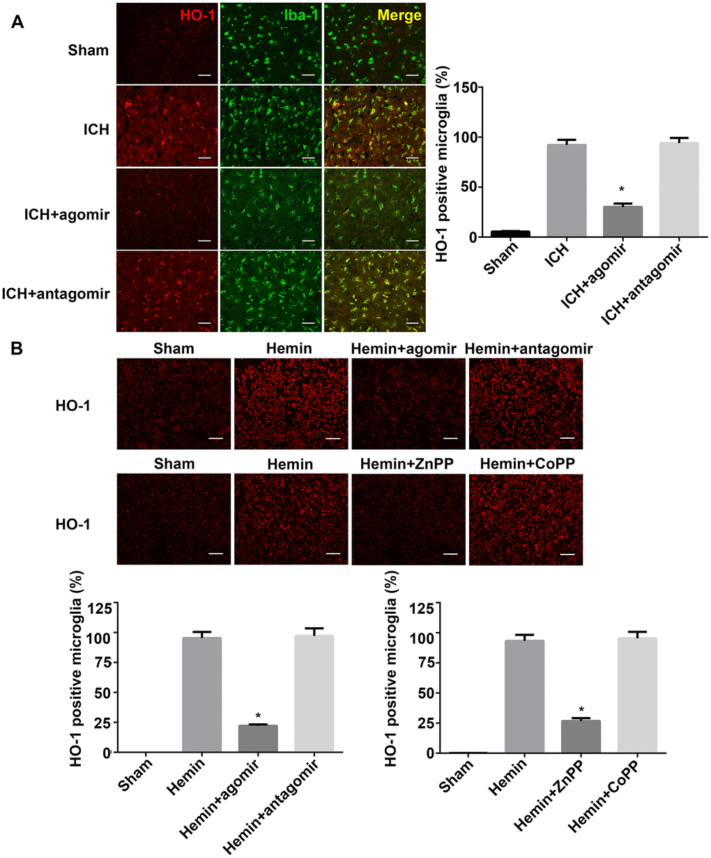 Our previous study and other reports have demonstrated that HO-1 is expressed primarily in the microglia after ICH in mice. In addition, downregulation of HO-1 reduced the number of activated microglia [25, 26, 28]. Fluorescence microscopy analysis of HO-1 expression in this study indicated that, as previously reported, HO-1 was expressed mostly in the microglia after ICH and that HO-1 expression was significantly lower in the miRNA agomir group (P < 0.05, Figure 6A). Although HO-1 expression was slightly higher in the miRNA antagomir group (Figure 6A), this difference was not statistically significant (P > 0.05). The in vitro expression of HO-1 revealed that the regulatory effect of miRNA-183-5p was similar to that of HO-1 activator or inhibitor (Figure 6B).