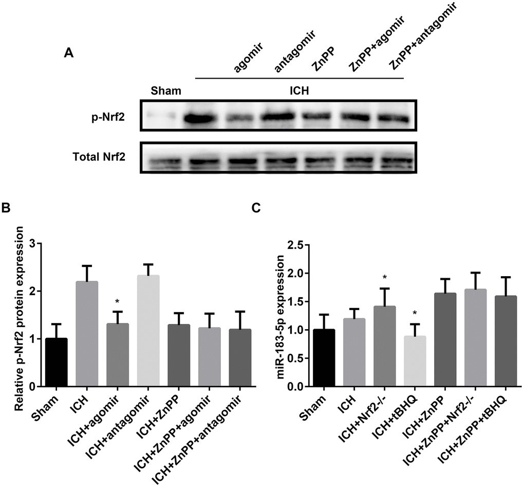Because Nrf2 is recognized as the main regulator of HO-1 [29, 30], we determined the relationship between miR-183-5p, HO-1, and Nrf2 after ICH. After ICH, Nrf2-/- mice exhibited low HO-1 expression, and treatment with tBHQ, an Nrf2 activator, increased HO-1 expression in WT mice with ICH (Supplementary Figure 6A). When HO-1 expression was regulated by CoPP or ZnPP, p-Nrf2 was increased or decreased, respectively (Supplementary Figure 6B). In miR-183-5p agomir–treated Nrf2-/- mice, HO-1 expression was significantly inhibited (P < 0.05), but in miR-183-5p antagomir–treated Nrf2-/- mice, HO-1 expression was slightly, although not significantly, increased (P > 0.05) (Supplementary Figure 6C). Among the Nrf2-/- mice, miR-183-5p expression was higher in the group pretreated with the HO-1 inhibitor ZnPP (P < 0.05) and slightly reduced in the group pretreated with the HO-1 activator CoPP (P > 0.05, Supplementary Figure 6D).