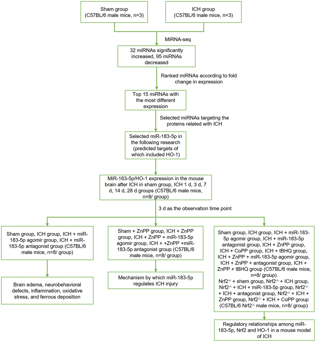 In this study, we observed changes in the expression of many miRNAs in the brain tissue of mice after ICH. Among these miRNAs, miR-183-5p was demonstrated to have a protective effect on ICH mice. After injecting agomir-183-5p into the lateral ventricles of ICH mice, we observed a decrease in iron accumulation, brain ROS production, BBB injury, the inflammatory response, neurologic impairment, and microglial activation. Although previous studies have shown that the HO-1 activator CoPP can significantly increase the expression of HO-1, the antagomir of miR-183-5p did not upregulate the expression of HO-1 as expected. We have found that the physiologic level of miR-183-5p is not high in brain tissue. Agomir is a chemically modified miRNA; in vivo injection of agomir can greatly increase the expression of miR-183-5p and thus promote its role in inhibiting HO-1. Antagomir can combine with miR-183-5p after ICH, resulting in the loss of its ability to bind HO-1 mRNA. However, due to the further decrease in miR-183-5p expression after ICH, the degree of miR-183-5p inhibition by antagomir is not enough to significantly restore the effect of HO-1.