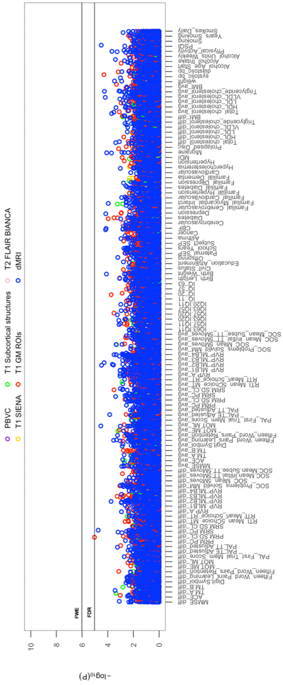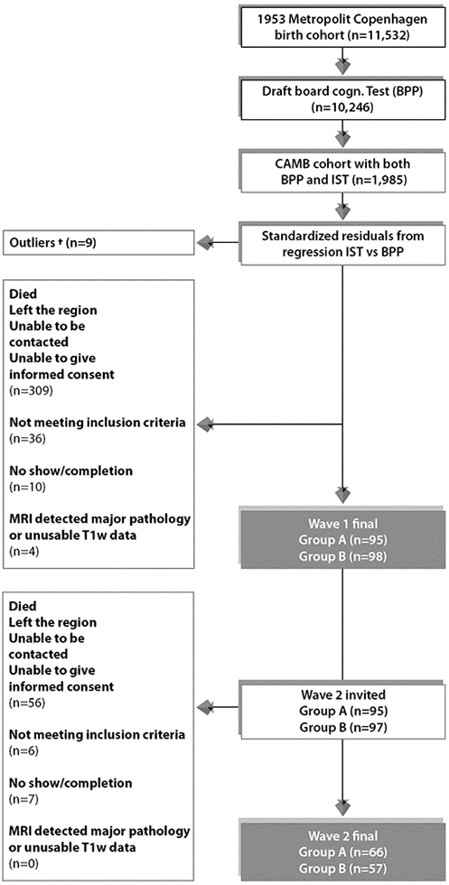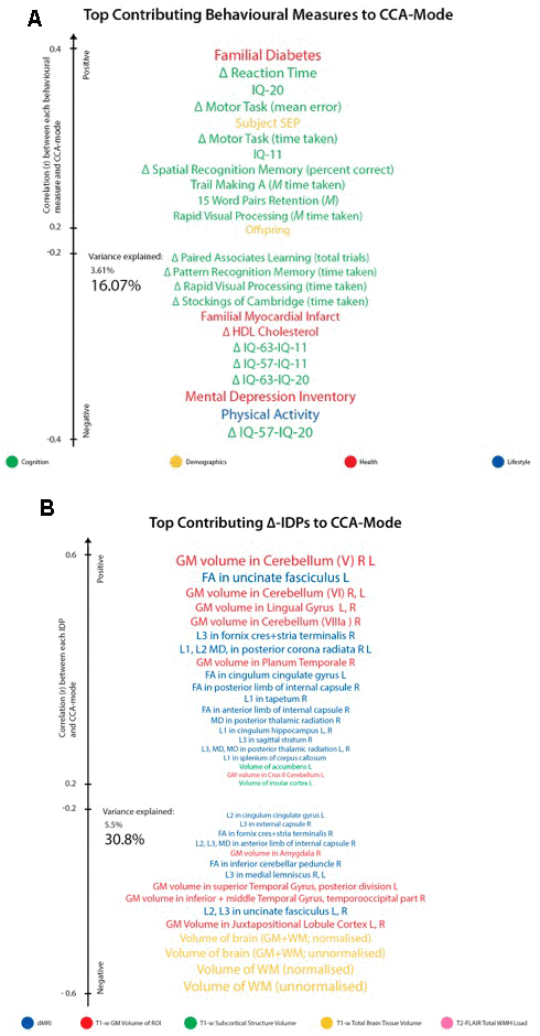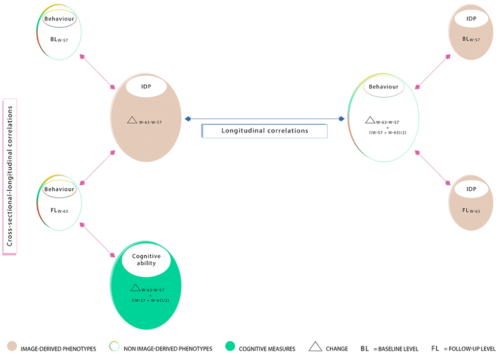 Thus, in this present study, we use a single-year-of-birth cohort where the majority of subjects have completed two early intelligence quotient (IQ) tests at ages ~11 (IQ-11) and ~20 (IQ-20). Subsequent, brain-imaging and behavioural assessments were conducted in two late-midlife waves separated by an observation interval of ~5 years. Here, detailed neuropsychological, brain MRI, general health, demographic, and lifestyle data have been acquired to investigate three key questions: First, exploring cross-sectional-longitudinal associations we asked: do midlife-baseline (age ~57; W-57) and follow-up (age ~63; W-63) brain structure correlate with changes in cognitive functioning, and relatedly, does W-57 or W-63 cognitive ability correlate with changes in brain structure? Second, we explored the impact of pure cross-sectional information on longitudinal associations: How are associations of longitudinal change in brain structure and cognitive ability altered when average measures are controlled for (i.e., assessed by comparing correlations between longitudinal changes before and after regressing out average measures ((W-57+W-63)/2)? Third, we explored the extent and direction in which common age-related risk and protective factors influence the observed brain-cognition relations in questions 1 and 2.