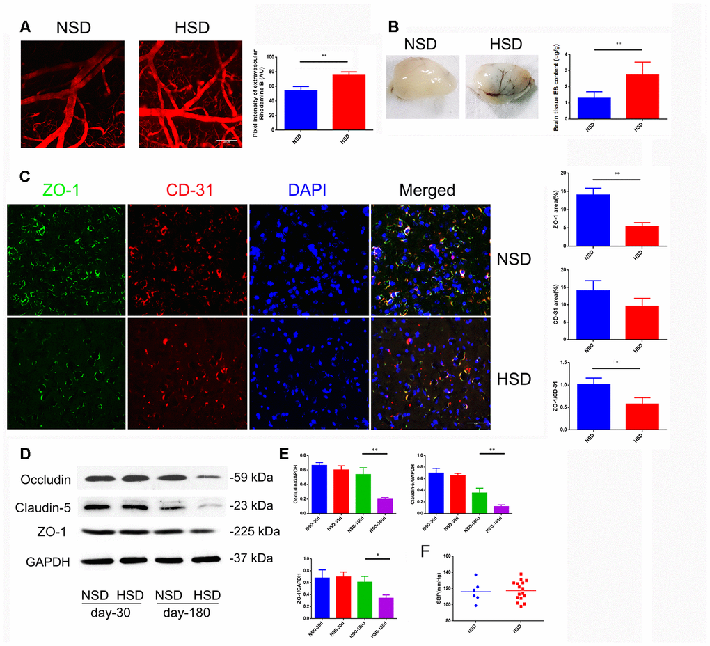 Increased cerebral microvascular permeability is the key to many peripheral inflammatory factors entering the CNS, leading to a variety of diseases. Inspired by previous epidemiological data, we studied the effect of HSD on the CNS. First, we analyzed the permeability of the mice cortical microvessels with a diameter of 20-40um in vivo by two-photon imaging. We found that intravascular dye leaked into extravascular space in the HSD group (Figure 1A). Next, we used the Evans blue dye (EBD) to assess the effect of HSD rats on the permeability of whole cerebral vessels. As shown in Figure 1B, the EBD leakage was significantly increased in the HSD group compared to the normal diet group (Day-180: P<0.05). Thus, we analyzed the expression of TJ-associated proteins in the brain tissues from rats fed HSD or normal salt diet (NSD), by using immunofluorescence staining and western blotting (Figure 1C, 1D). No significant changes were observed in the expression of ZO-1, occluding, and claudin-5 between the HSD and NSD groups, when high salt was fed for 30 days (Figure 1D, 1E). However, HSD dramatically decreased the expression of ZO-1, occludin, and claudin-5 after 180 days of high salt feeding (Figure 1D, 1E). Immunofluorescence double staining confirmed that the ZO-1 expression was down-regulated in CD31-positive microvascular in HSD rats fed for 180 days (Figure 1C).