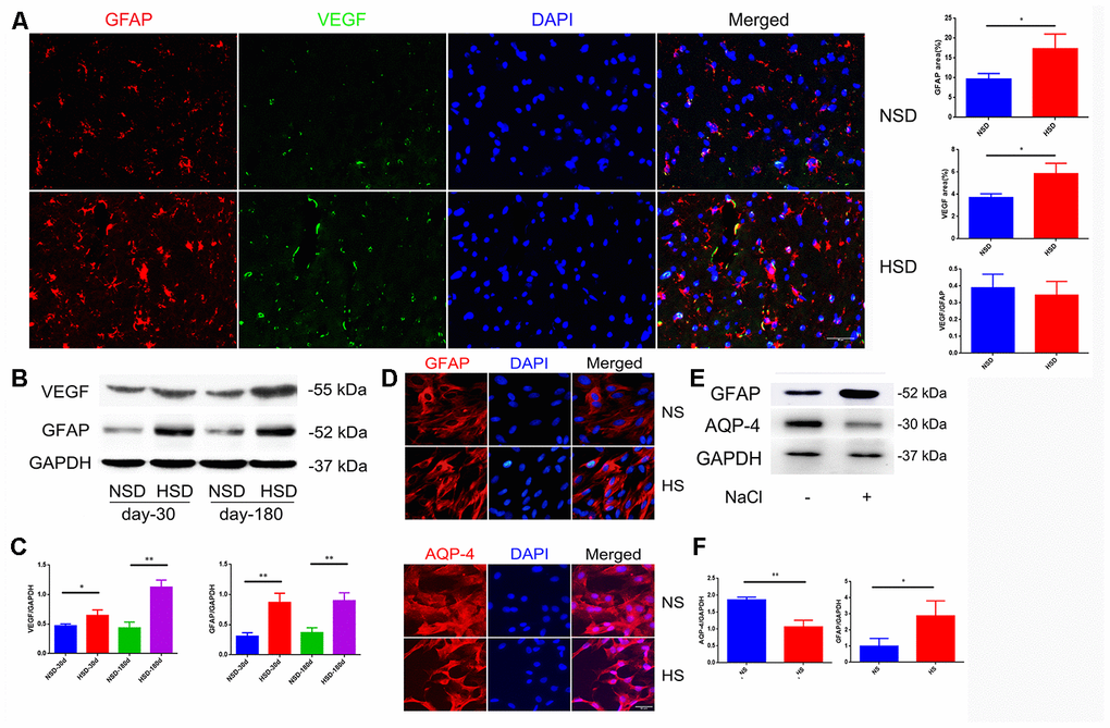 Due to the strong effect on increased vascular permeability, VEGF is also called vascular permeability factor, which is mainly secreted by astrocytes [20]. Therefore, we examined the protein expression of VEGF and the astrocyte marker GFAP in the brain. Interestingly, immunofluorescence double staining showed that HSD up-regulated the expression of VEGF and GFAP in the rat brain (Figure 2A); this was also confirmed by western blotting (Figure 2B, 2C).