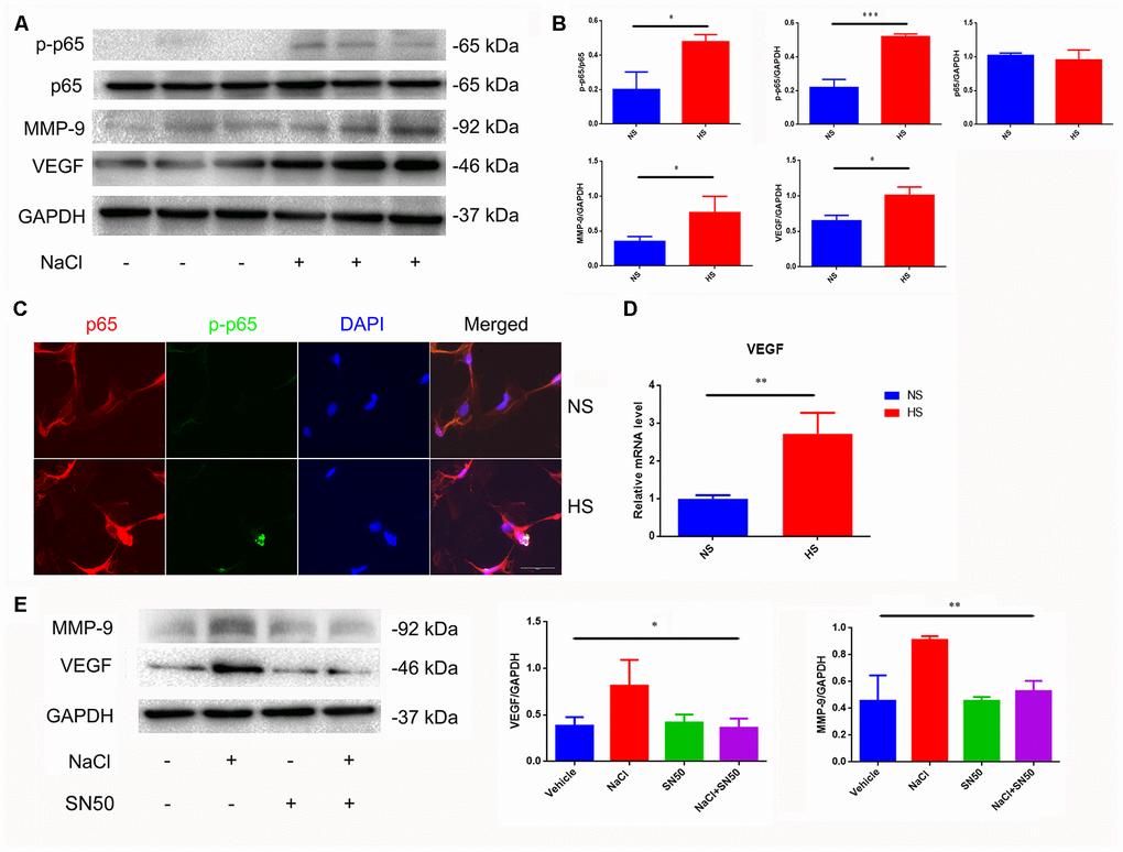 Matrix metalloprotease-9 (MMP-9) is involved in the homeostasis of the extracellular matrix, and participates in angiogenesis by releasing VEGF [23]. We found that the MMP-9 and VEGF expression was significantly increased under high-salt conditions (Figure 3A, 3B, 3D). By using the SN50 inhibitor of p65 nuclear translocation, we found that SN50 decreased the protein expression of VEGF and MMP9 (Figure 3E), indicating that HSD induces VEGF and MMP-9 through the p65 NF-κB-dependent pathway.