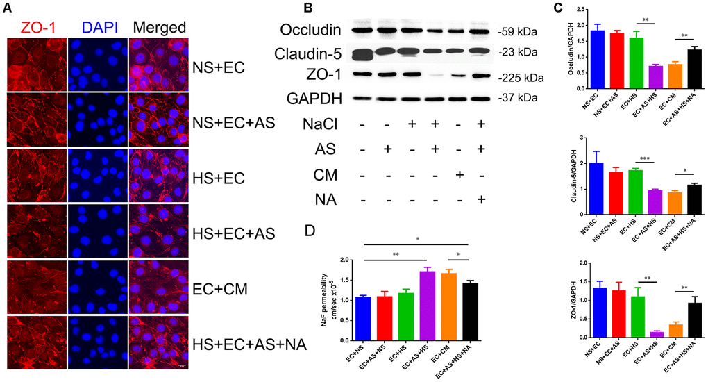 To determine whether the astrocyte-derived VEGF is involved in HS-induced tight junction destruction, mice brain microvascular endothelial cells, bEnd.3, were co-cultured with primary rat astrocytes in a transwell culture plate divided into 6 groups: 1. Endothelial cells cultured alone in normal medium (NS+EC group); 2. Endothelial cells co-cultured with astrocytes in normal medium (NS+EC+AS group); 3. Endothelial cells cultured in high-salt medium (40mM NaCl for 24h) alone (HS+EC group); 4. Endothelial cells co-cultured with astrocytes in high-salt medium (HS+EC+AS group); 5. Astrocytes pre-treated with 40mM NaCl(24h), and cultured with endothelial cells in conditioned medium (EC+CM group); 6. VEGF neutralizing antibodies (NA; 0.1μg/mL) added into the HS+EC+AS group, and cultured 24h (HS+EC+AS+NA group). Immunofluorescence staining was performed to analyze the morphology of ZO-1, one of the TJ proteins. As shown in Figure 4A, the structure of ZO-1 was intact and normal when endothelial cells were exposed to NaCl directly. However, the expression of ZO-1 was destroyed when endothelial cells were co-cultured with astrocytes in high salt conditions, or treated with conditioned medium from high salt-cultured astrocytes. Western blotting showed that the expression of occludin, claudin-5, and ZO-1 decreased in the HS+EC+AS and EC+CM groups (Figure 4B, 4C). Analysis of the permeability of tight junctions using NaF showed similar results to western blotting (Figure 4D).