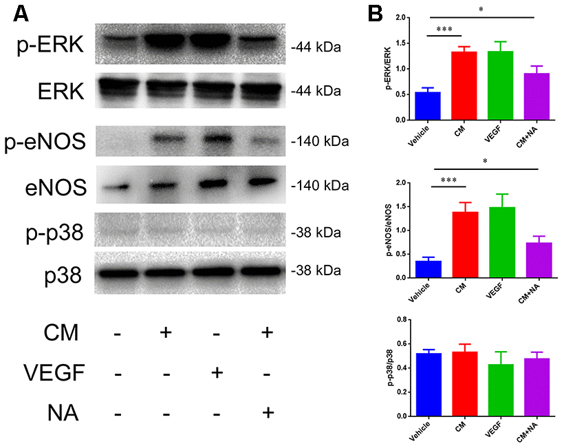 Next, we analyzed the molecular mechanism involved in the NaCl-mediated down-regulation of TJ protein expression. It has been reported that high-salt conditions increase eNOS phosphorylation, and activate thep38/MAPK pathway [24, 25]. Moreover, VEGF activates PLCγ, which stimulates MEK-MAPK and p38in endothelium, and induces expression of eNOS via PLCγ and PI3K [26]. Thus, we examined the phosphorylation status of ERK, eNOS, and p38, which represents the degree of activation, by western blotting. As shown in Figure 5, a dramatic up-regulation of p-ERK/ERK and p-eNOS/eNOS levels was observed in endothelial cells treated with conditioned medium from high salt-cultured astrocytes, or with VEGF recombinant rat protein. Anti-VEGF neutralizing antibody (NA) partially reversed the up-regulation of p-ERK/ERK and p-eNOS/eNOS levels.