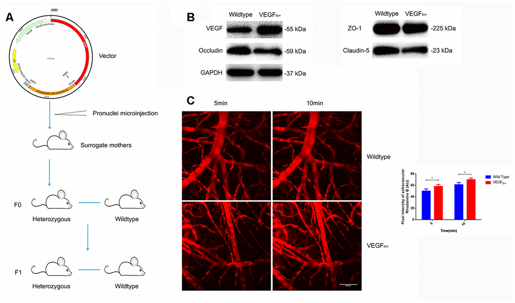 We inserted the Glial fibrillary acidic protein (GFAP) promoter and mVegfa open reading frame in a regular plasmid to construct a gene expression vector. By pronuclear microinjection, we injected the constructed vector into the fertilized egg, which was then implanted into a surrogate mother to obtain the desired offspring through germline transmission.