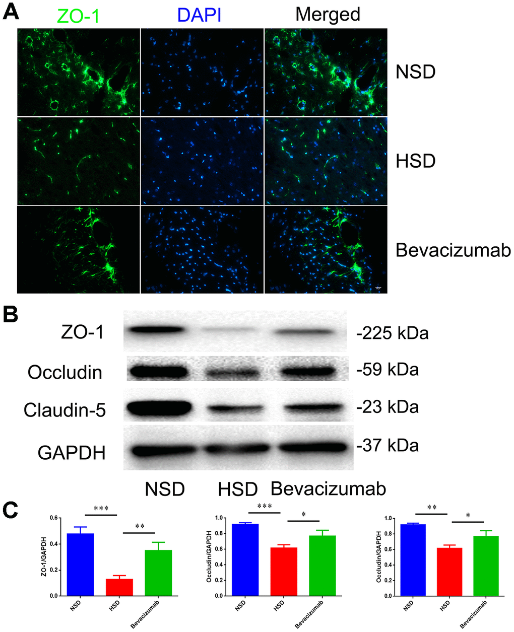 Next, we tested if blocking VEGF using the bevacizumab antibody could reduce the destruction of tight junctions induced by HSD. Rats in the HSD group were intraperitoneally injected with10 mg/kg bevacizumab or an equal volume of normal saline (continuous administration for 30days). We found that the HSD-induced disruption of tight junction proteins in the rat brain could be attenuated by blocking VEGF with bevacizumab (Figure 7A–7C).
