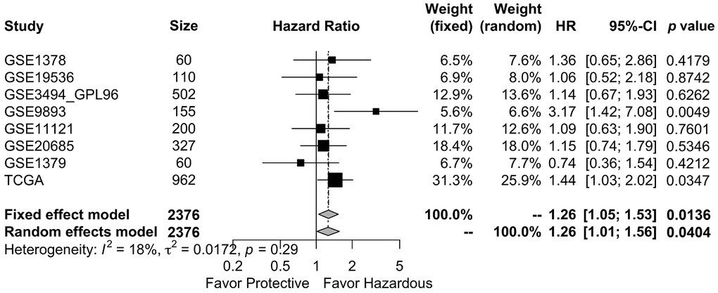 SurvExpress is an online biomarker validation tool (http://bioinformatica.mty.itesm.mx:8080/Biomatec/SurvivaX.jsp) that was used to investigate the prognostic value of GALNT6 [49]. Eight published breast cancer studies with a total of 2,376 samples were selected to investigate OS in the meta-analysis. Table 2 shows the cohorts list for meta-analysis with the default settings showing the study name, sample size, HR and 95% CI.