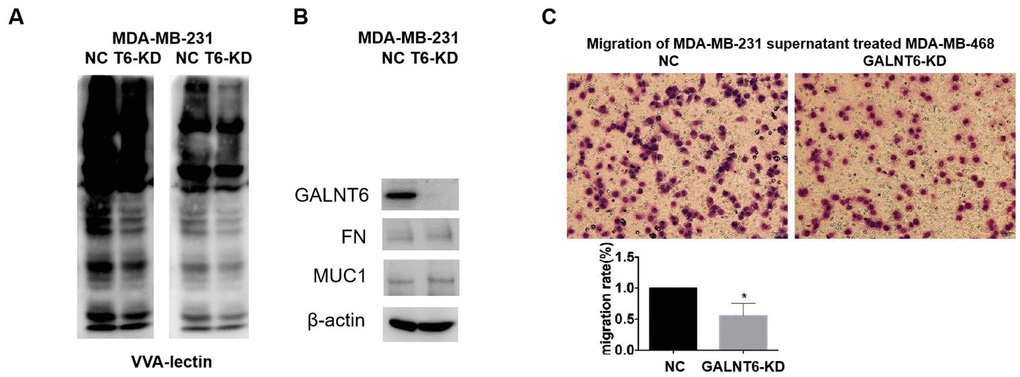 To investigate the effect of GALNT6-mediated mucin-type O-glycosylation of secretory proteins on the migration of MDA-MB-468 cells, the media of MDA-MB-231/GALNT6-KD and MDA-MB-231/NC cells cultured for 48 h were collected and added to the lower chamber. MDA-MB-468 cells were seeded into the upper chamber of the transwell plate. The migratory or invasive cells on the underside of the filter were photographed. Cells from five random fields of each well were counted to determine the average number of migratory or invasive cells.