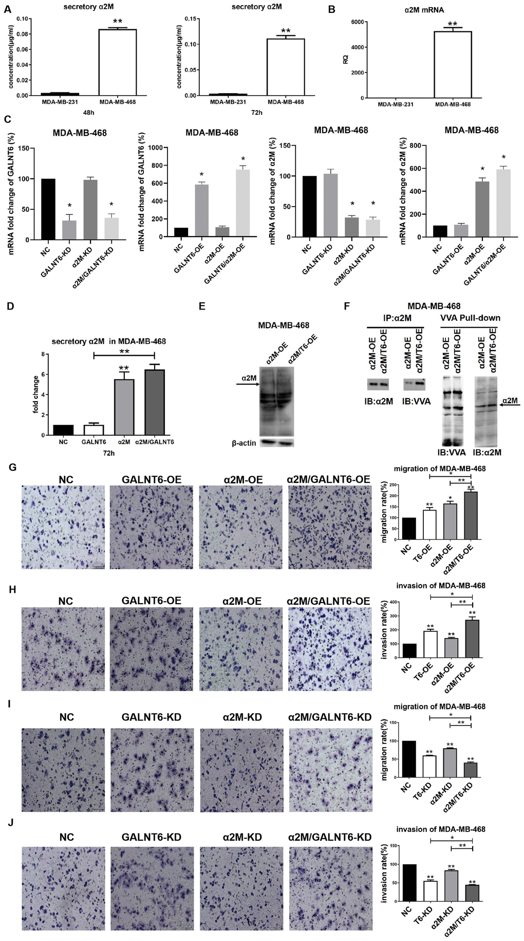 Real-time PCR and ELISA assay showed that the level of α2M was significantly higher in MDA-MB-468 than in MDA-MB-231 cells at both the transcriptional and secretory levels (Figure 6A, B). To clarify the effect of mucin-type O-glycosylation of α2M on cell migration and invasion, GALNT6 and α2M were overexpressed or knocked down in MDA-MB-468 cells (Figure 6C). α2M OE could effectively increase the secretory levels of α2M in MDA-MB-468 and MDA-MB-468/GALNT6-OE cells, whereas GALNT6 OE did not increase the secretory levels of α2M (Figure 6D). However, in simultaneous overexpression of GALNT6 and α2M MDA-MB-468, O-GalNAc levels of overall protein, including α2M (arrow) was effectively increased in comparison to MDA-MB-468/α2M-OE cells (Figure 6E). Accordingly, VVA lectin pull-down assays confirmed that the mucin-type O-glycosylation level of α2M was significantly higher in simultaneous overexpression of GALNT6 and α2M MDA-MB-468 than in MDA-MB-468/α2M-OE cells (Figure 6F). Also, α2M OE significantly enhanced the migratory and invasive abilities of MDA-MB-468 and MDA-MB-468/GALNT6-OE cells (Figure 6G, 6H). α2M KD significantly suppressed the migratory and invasive abilities of MDA-MB-468 cells and MDA-MB-468/GALNT6-OE cells (Figure 6I, 6J). Taken together, these results indicated that GALNT6 promoted migration and invasion by catalyzing mucin-type O-glycosylation of α2M.