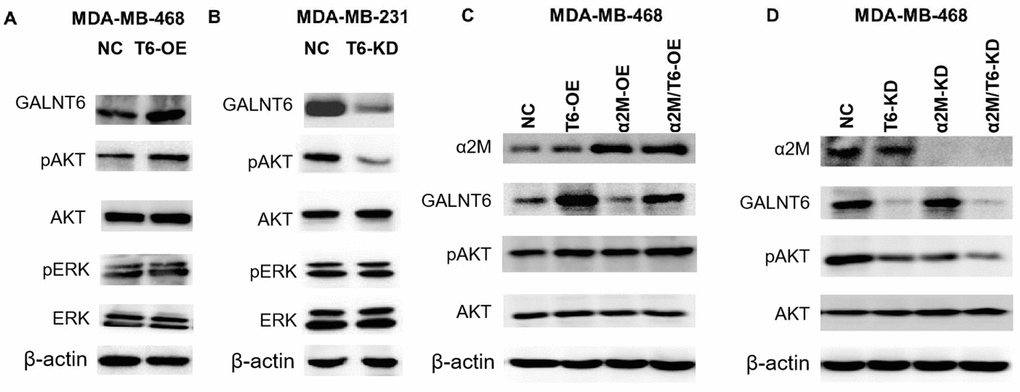PI3K/Akt and MAPK/ERK signaling pathways were involved in GALNT6 or other GALNTs-induced cancer metastasis [26–29]. To confirm whether GALNT6-promoted metastasis is mediated by these signaling pathways, the effect of GALNT6 on the activation of Akt and ERK was detected by Western blotting. The result showed that GALNT6-OE increased Akt phosphorylation level in MDA-MB-468 cells (Figure 7A), whereas GALNT6-KD decreased Akt phosphorylation in MDA-MB-231 cells (Figure 7B). GALNT6-OE-activated PI3K/Akt signaling was further enhanced by α2M-OE (Figure 7C), whereas GALNT6-KD-inhibited PI3K/Akt signaling was further suppressed by α2M-KD (Figure 7D). However, neither KD nor OE of GALNT6 and α2M altered the phosphorylation level of ERK. These results showed that GALNT6 mediated-mucin-type O-glycosylation of α2M could activate PI3K/Akt signaling.