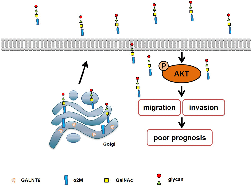 In summary, our study demonstrates that GALNT6 can promote metastasis by increasing mucin-type O-glycosylation of α2M, and activating the downstream PI3K/Akt signaling pathway in breast cancer cells (Figure 8). These findings provide a new idea for studying the role of GALNT6 in promoting a malignant phenotype and poor prognosis of breast cancer.