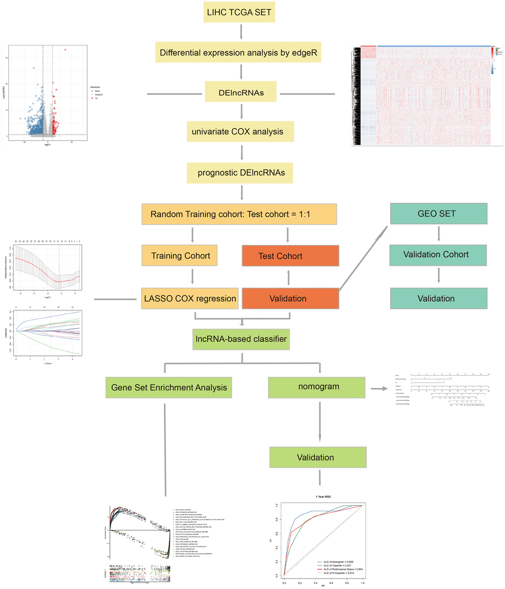 LncRNAs of LIHC set was re-annotated by the gene annotation file " gencode.v30.long_noncoding_RNAs ", which is Downloaded from the gencode website. 15113 lncRNAs were identified from LIHC set. The expression value of each lncRNA was normalized with the TMM function of the ‘limma’ and ‘edgeR’ package for further analysis [32]. We used the ‘edgeR’ package to test all the data to identify lncRNAs that were differentially expressed by |logFC| >2 and padj < 0.05 in the tumor compared with normal samples. Then, the differentially expressed lncRNAs (DElncRNAs) were subjected to univariate Cox regression, and lncRNAs with p < 0.05 were identified as prognostic DElncRNAs for further research. GEO's lncRNAs were identified by the gpl platform annotation file and the Fasta file "gencode.v32.lncRNA_transcripts.fa".3494 lncRNAs were identified from GSE76427 and 5690 lncRNAs were identified from GSE116174. The OS-related prognostic DElncRNAs that intersect with GSE116174 are used for the development of OS-classifiers. Prognostic DElncRNAs associated with recurrences that intersect with GSE76427 are used to construct recurrence-classifiers. Because the detection methods used by the TCGA database and the GEO database are different, the background noise is also different. So we log2 (x + 1) the TCGA data set and normalize it using the zscore method. zscore normalization is also performed in the GEO dataset. The "sva" package is used to remove batch effects between TCGA and GEO datasets.