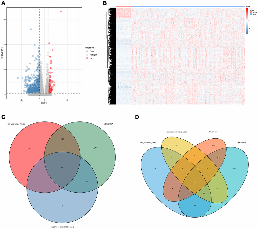 The workflow of this article is shown in Figure 1. In the expression profiles of HCC tumors compared with the samples from normal tissues, we identified 669 differentially expressed lncRNAs (DElncNRAs) of |log Fold Change| ≥ 2 and p < 0.05(Supplementary Table 1 and Figure 2A). Of which, 595 lncRNAs were down-regulated and 74 lncRNAs were up-regulated. As shown in Figure 2B, significant differential expression was detected between the tumor and the adjacent normal groups. Subsequently, the DElncRNAs with P <0.05 were selected by univariate COX regression analysis. Therefore, a total of 191 OS-related lncRNAs and 86 recurrence-related lncRNAs were reserved for further study (Figure 2C). After taking the intersection with GSE76427 and GSE116174, 21 recurrence-related lncRNAs and 85 OS-related lncRNAs were finally obtained for classifier development. A total of 312 patients with OS data were randomized 1:1 into two groups, the training cohort (n=156) and the test cohort (n=156). The GSE116174 (n=64) was reserved as a validation cohort for predicting OS. Meanwhile, a total of 269 patients with recurrence data were randomly divided equally into two groups, the training cohort (n= 130) and the test cohort (n=139). GSE76427 (n= 81) was used as a validation cohort to validate recurrence-related models. LASSO COX selection method was applied to training cohort to develop a prediction model (OS: Figure 3A, 3B; recurrence: 3F, 3G). As shown in Supplementary Tables 2, 8 OS-related DElncRNAs and 14 recurrence-related DElncRNAs were identified by the LASSO COX selected model.