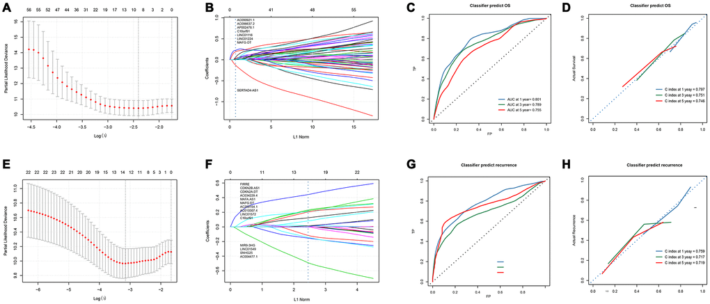 In conclusion, we proved that the lncRNA-based classifier devised by LASSO cox method can accurately predict survival and recurrence, and divide HCC patients into low- and high-risk groups. Furthermore, the novel nomogram constructed based on this classifier combined with clinical characterization can not only visually predict HCC survival and recurrence, but also increase its prognostic value, making it a potentially valuable biomarker signature in clinical practice.