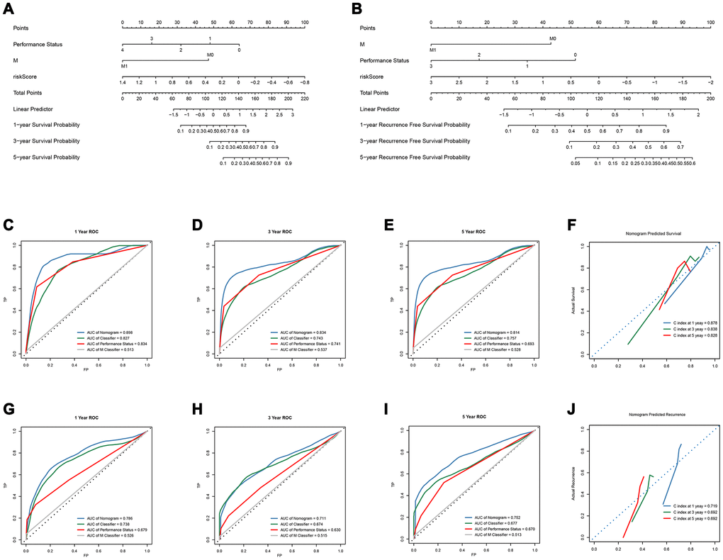 Subsequently, we constructed a gene-clinical nomogram (Figure 4A, 4B) by multivariate cox regression analysis (Supplementary Table 11, Table 1), combined with clinical characterization and lncRNAs-based classifier. TNM M stage, Performance Status and an 8-lncRNAs-based classifier were included in the gene-clinical nomogram of OS, while TNM M stage, Performance Status and 14-lncRNAs-based classifier were included in the gene-clinical nomogram of recurrence. Nomograms can visually predict the prognosis of patients according to their genes and clinical information, and accurately predict the survival and recurrence of patients at 1-, 3-, and 5 years. Moreover, the score of the nomogram was retained for development and validation of the performance of the nomogram risk score (Supplementary Tables 3 and 4). The risk score of OS-nomogram = 1/(-45.629*Classifier - 47*M - 16*Performance Status + 134.689). The risk score of recurrence-nomogram = 1/(-20*Classifier - 43*M -17.3*Performance Status + 94.7). And the accuracy of the nomogram in 1, 3 and 5 years was analyzed by tdROC, and the corresponding calibration curve was drawn (Figure 4).