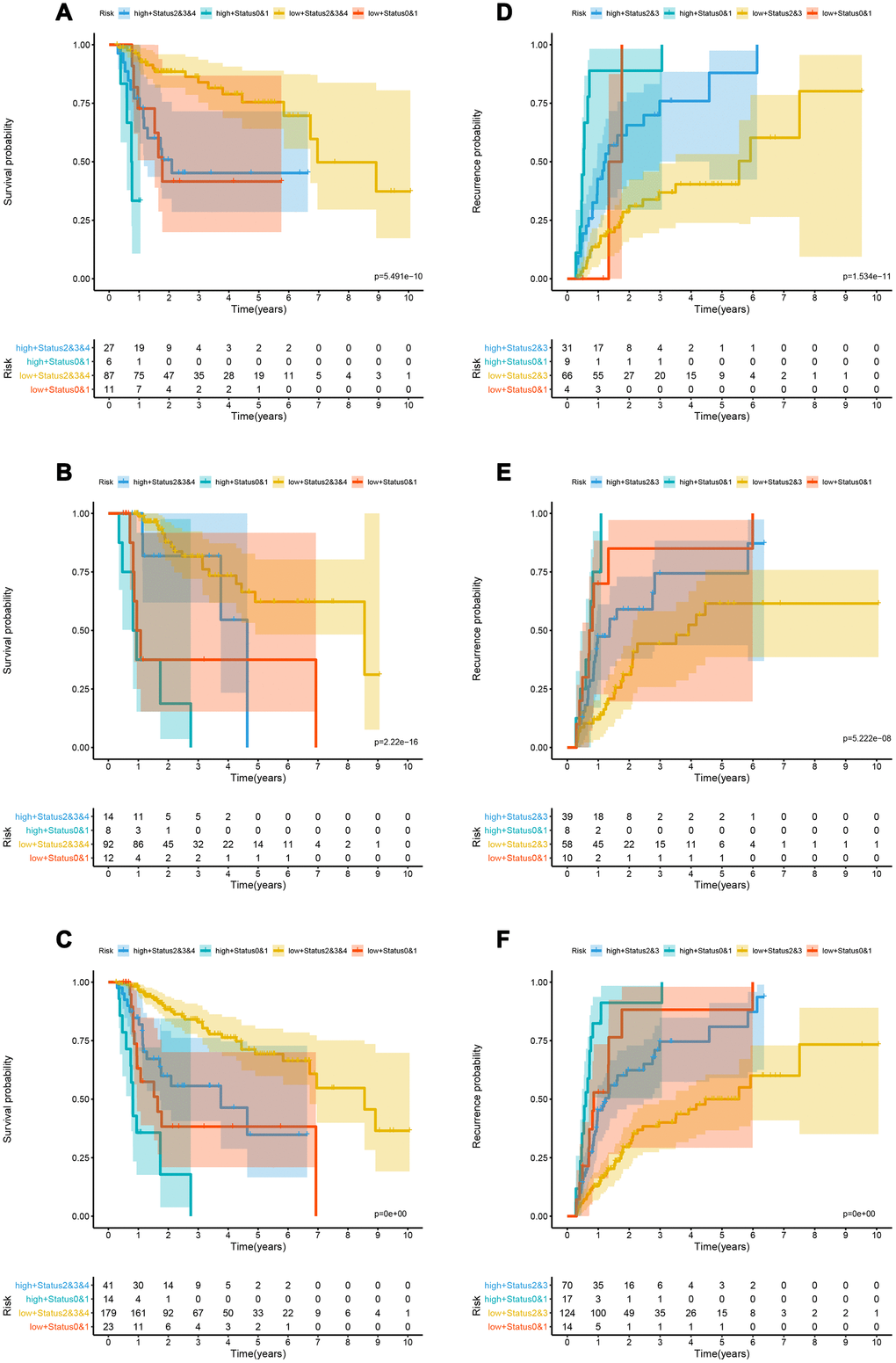 The td-ROC showed that the recurrence-nomogram based on classifier, TNM M stage and Performance Status has an AUC of 0.786, 0.711, and 0.752 for predicting 1, 3, and 5 years of recurrence, respectively. The C-index of 1, 3, and 5 years was 0.719, 0.692, and 0.692, respectively (Figure 4G–4J). The Kaplan-Meier curve analysis also indicated that the prognosis of patients stratified by cutoff value (0.01470) calculated by X-tile was significantly different (Supplementary Figure 3D–3F). The lncRNA-based classifiers with TNM stage could distinguish patients in the training cohort, the test cohort and the TCGA cohort into the different risk of recurrence (p< 0.0001, Figure 5D–5F). As shown in Supplementary Table 6, the tests were performed by log rank test between groups.