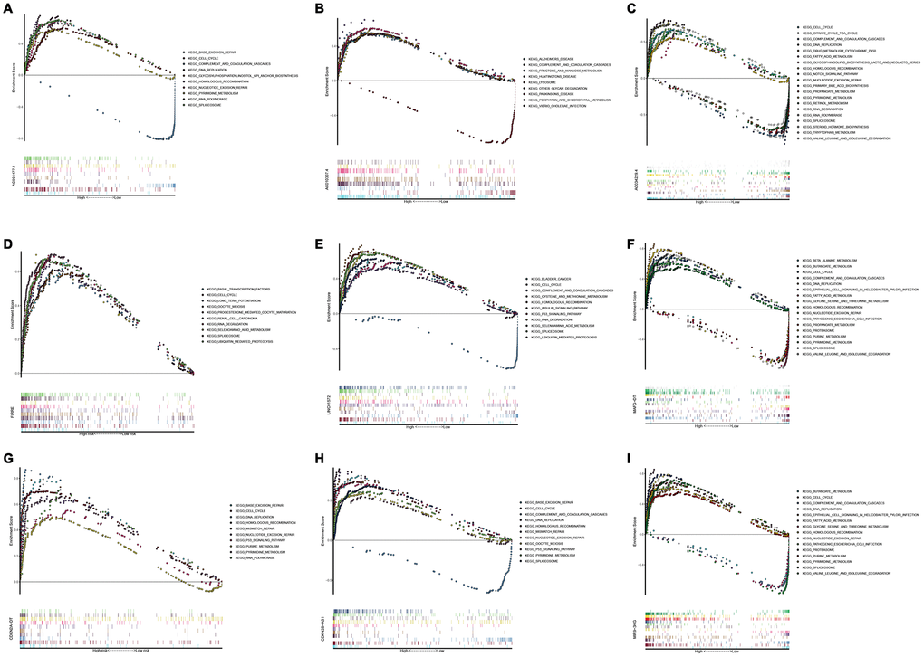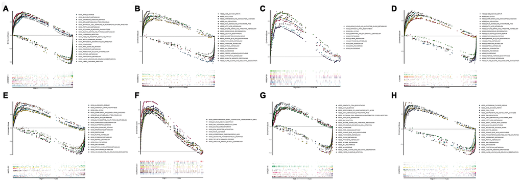 In order to investigate different activated KEGG signaling pathways in HCC, GSEA was performed on 8 OS-related lncRNAs and 14 recurrence-related lncRNAs expression datasets. We considered the difference as statistically significant when | NES | ≥ 1, NOM p-value <0.01 and FDR q-val <0.25. All significant enrichment pathways were listed in Supplementary Tables 7 and 8. Figure 6 showed the most significant KEGG pathway function enrichment of 8-OS-related lncRNAs. Figure 7 showed the most significant KEGG pathway function enrichment of 14-recurrence-related lncRNAs. The results showed that Aminoacyl TRNA biosynthesis, Arginine and proline metabolism, Basal transcription factor, Base excision repair, Bladder cancer, Cytoplasmic DNA sensing pathway, DNA replication, Epithelial Signaling in Helicobacter Pylori Infection, Focal adhesion, Gap junction, homologous recombination, leukocyte transendothelial migration, Mapk signaling pathway, Nod like receptor signaling pathway, p53 signaling pathway, pathways in cancer, nucleotide excision repair, RNA degradation, cell cycle, spliceosome, VEGF signaling pathway, and WNT signaling pathways showed consistent enrichment in the up-regulated phenotypes of 8-OS-related lncRNAs (Figure 6). The results showed that Basal transcription factor, Base excision repair, DNA replication, mismatch repair, Lysosome, proteasome, homologous recombination, leukocyte transendothelial migration, P53 signaling pathway, pathways in cancer, Nucleotide excision repair, RNA degradation, cell cycle, and spliceosome signaling pathways showed consistent enrichment in the up-regulated phenotypes of 14-recurrence-related lncRNAs (Figure 7).