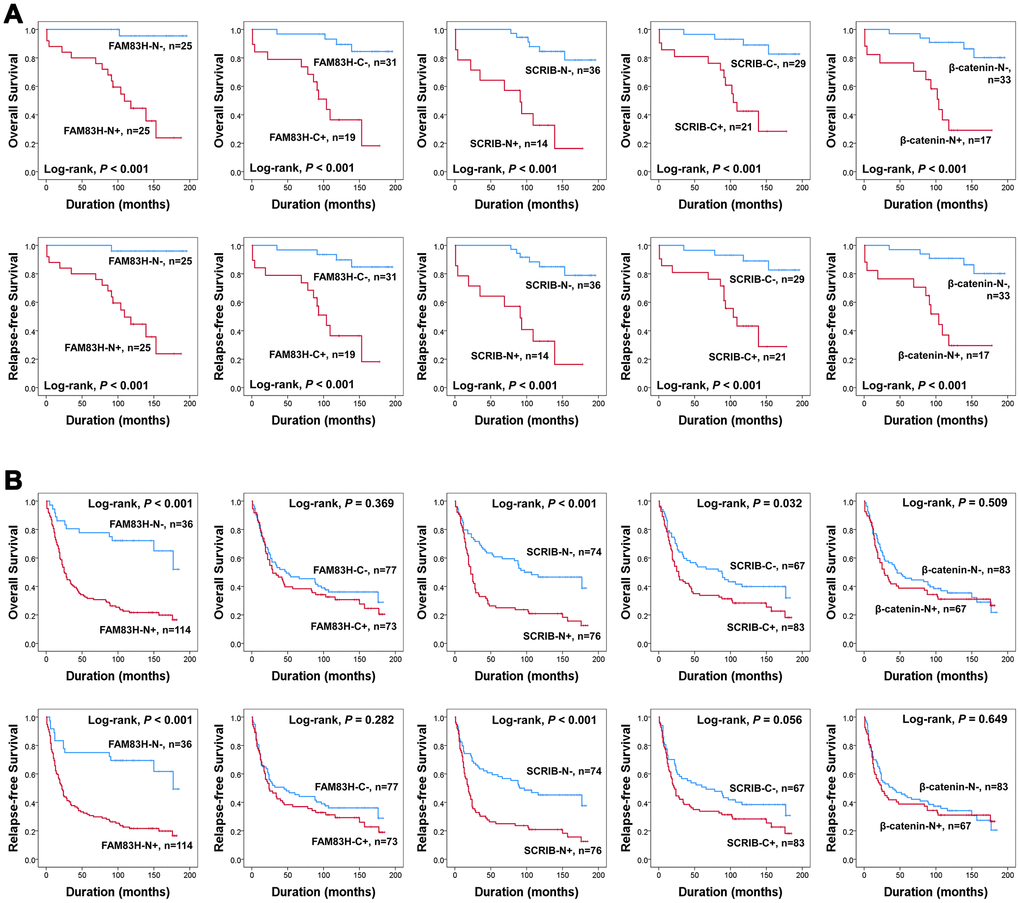 | Characteristics | No. | FAM83H-N | FAM83H-C | SCRIB-N | SCRIB-C | β-catenin-N | |||||||||||||||||||||||||||||||||||||||||||||||||||||||||||||||||||||||||||||||||||||||||||||