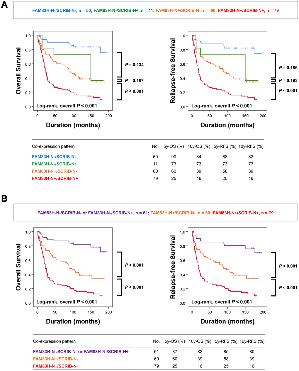 In addition, as shown in Tables 1 and 2, there was a significant association between the expression of FAM83H-N, FAM83H-C, SCRIB-N, and SCRIB-C, and the prognostic impacts of FAM83H-N and SCRIB-N were stronger than FAM83H-C and SCRIB-C; the hazard ratios are greater in FAM83H-N and SCRIB-N expression compared with FAM83H-C and SCRIB-C expression. Based on these results, we further evaluated the prognostic impact of the co-expression patterns of FAM83H-N and SCRIB-N. When we sub-grouped gastric carcinomas into FAM83H-N-/SCRIB-N-, FAM83H-N-/SCRIB-N+, FAM83H-N+/SCRIB-N-, and FAM83H-N+/SCRIB-N+ subgroups, the FAM83H-N-/SCRIB-N- subgroup had the longest survival and the FAM83H-N+/SCRIB-N+ subgroup had the shortest survival (Figure 3A). However, the differences in survival between the FAM83H-N-/SCRIB-N-, FAM83H-N-/SCRIB-N+, and FAM83H-N+/SCRIB-N- subgroups were not significant. Therefore, we re-grouped gastric carcinomas into three subgroups: favorable (FAM83H-N-/SCRIB-N- or FAM83H-N-/SCRIB-N+), intermediate (FAM83H-N+/SCRIB-N-), and poor (FAM83H-N+/SCRIB-N+) subgroups. In-between these subgroups, there was a significant difference in OS and RFS. The 5- and 10-year OS rates of the favorable (FAM83H-N-/SCRIB-N- or FAM83H-N-/SCRIB-N+) subgroup were 87% and 82%, respectively. The 5- and 10-year OS rates of the poor subgroup with FAM83H-N+ and SCRIB-N+ were 25% and 16%, respectively. The 5- and 10-year OS rates of the intermediate (FAM83H-N+/SCRIB-N-) subgroup were 60% and 39%, respectively (Figure 3B).