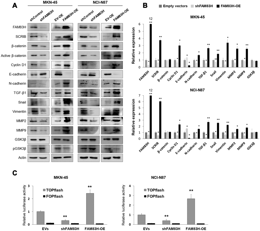 Based on the prognostic significance of the expression of FAM83H and SCRIB in gastric carcinoma patients, we performed proliferation and migration/invasion assays after inducing knock-down or overexpression of FAM83H and SCRIB in gastric cancer cells. In MKN-45 and NCI-N87 gastric cancer cells, the proliferation of cells was inhibited with knock-down of FAM83H and increased with overexpression of FAM83H (Figure 4A). In addition, FAM83H stimulated the migration and invasion activity of MKN-45 and NCI-N87 cells (Figure 4B, 4C). Knock-down of FAM83H decreased protein and mRNA expression of SCRIB, cyclin D1, N-cadherin, TGF-β1, snail, vimentin, MMP2, and MMP9, and increased the expression of E-cadherin in both MKN-45 and NCI-N87 cells (Figure 5A, 5B). Overexpression of FAM83H increased protein and mRNA expression of SCRIB, cyclin D1, N-cadherin, TGF-β1, snail, vimentin, MMP2, and MMP9, and decreased the expression of E-cadherin in both MKN-45 and NCI-N87 cells (Figure 5A, 5B). Also, the knock-down of FAM83H decreased the protein levels of β-catenin and active β-catenin and overexpression of FAM83H increased the protein levels of β-catenin and active β-catenin. However, knock-down or overexpression of FAM83H did not affect mRNA expression of β-catenin (Figure 5A, 5B). The protein and mRNA expression of GSK3β were not altered with knock-down or overexpression of FAM83H (Figure 5A, 5B). However, knock-down of FAM83H increased the protein level of phosphorylated GSK3β, and overexpression of FAM83H decreased the protein level of phosphorylated GSK3β (Figure 5A). Furthermore, TOPflash reporter activity, but not FOPflash activity, was significantly decreased with knock-down of FAM83H and was significantly increased with overexpression of FAM83H (Figure 5C).