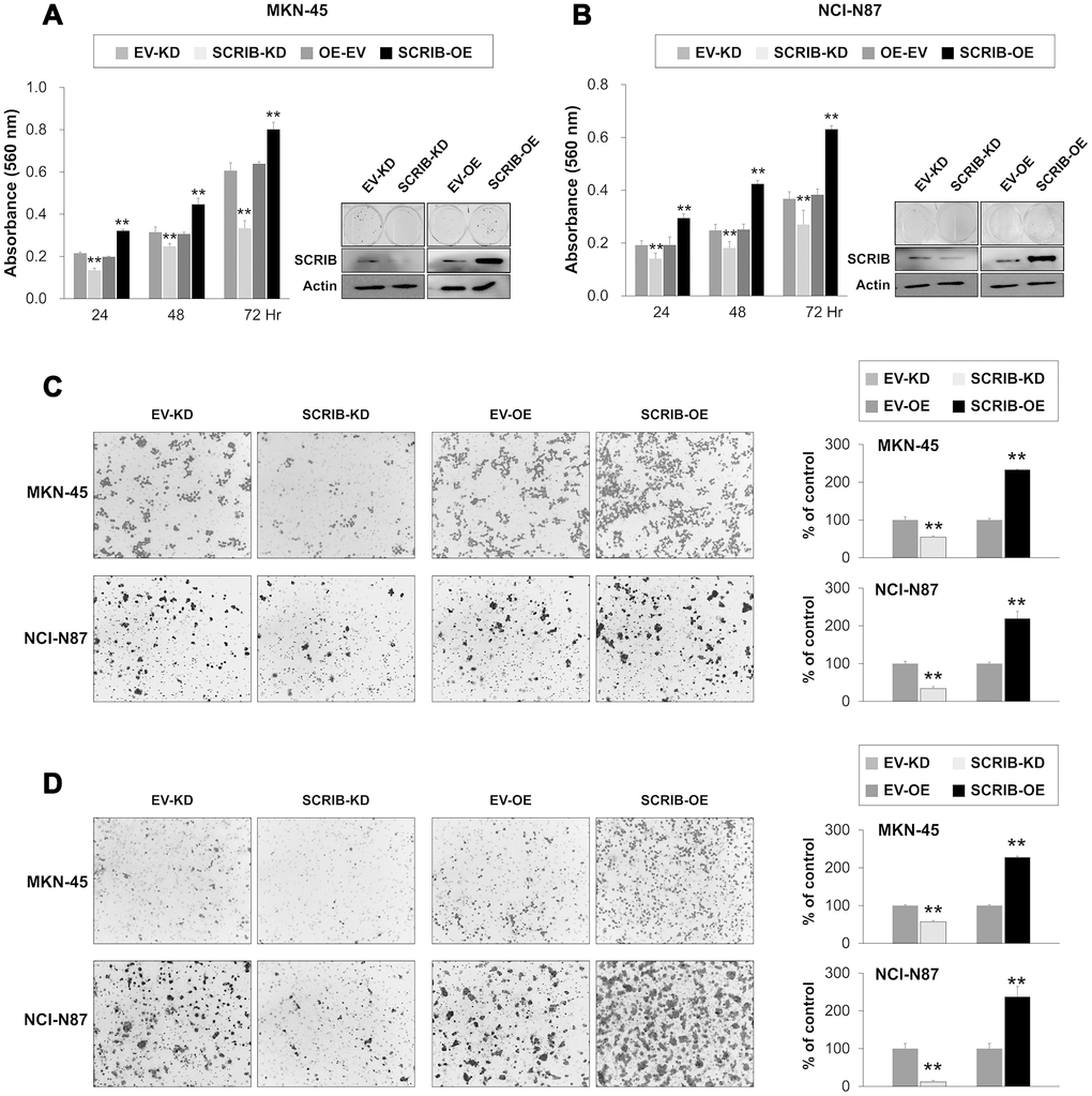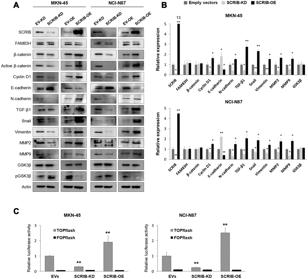 Two human gastric cancer cell lines, MKN-45 (wild type for FAM83H, SCRIB, CTNNB1, APC, GSK3B, AXIN1, and BTRC) and NCI-N87 (wild type for FAM83H, SCRIB, CTNNB1, APC, GSK3B, AXIN1, and BTRC) were purchased from the Korean Cell Line Bank (KCLB, Seoul, Republic of Korea). The indicated cell lines were grown in RPMI-1640 medium supplemented with 10% fetal bovine serum (Gibco BRL, Gaithersburg, MD) and streptomycin and penicillin (100 U/ml). The knock-down of FAM83H was induced with shRNA for FAM83H (GenePharma, Shanghai, China). The FAM83H duplex had the sense and antisense sequences 5′-CACCGCTCATCTTC AGCACGTCACATTCAAGAGATGTGACGTGCTGAAGATGAGCTTTTTTG-3′ and 5′-GATCCAAA AAAGCTCATCTTCAGCACGTCACATCTCTTGAATGTGACGTGCTGAAGATGAGC-3′, respectively. To induce knock-down of SCRIB, we used hSCRIB CRISPR/Cas9 KO plasmid (Catalog #; sc-400384, Santa Cruz Biotechnology, Santa Cruz, CA). The overexpression vector for SCRIB (Catalog #; EX-Z2845-M03, accession #; NM_002467) and FAM83H (Catalog #; EX-Y4473-M03, accession #; NM_198488) were purchased from GeneCopoeia (Rockville, MD). Lipofectamine® 2000 DNA transfection reagent (Thermo Fisher Scientific, Waltham, MA) was used for transfection.