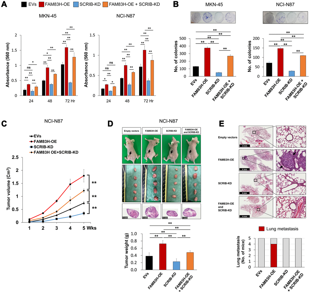 FAM83H and SCRIB stimulate the proliferation and invasiveness of gastric cancer cells, and the expression of SCRIB was dependent on FAM83H expression, but FAM83H was not affected by SCRIB expression. Therefore, we evaluated the effects of knock-down of SCRIB on gastric cancer cells on inducing the overexpression of FAM83H. Consistent with the results in Figure 3, overexpression of FAM83H increased proliferation, which was attenuated with knock-down of SCRIB in MKN-45 and NCI-N87 cells (Figure 8A, 8B). Consistent with these findings, overexpression of FAM83H stimulated in vivo growth of NCI-N87 cells and loss of SCRIB suppressed in vivo tumor growth compared with controls transfected with empty vectors (Figure 8C, 8D). The in vivo tumor growth of the cells that were induced to overexpress FAM83H and have a knock-down of SCRIB was intermediate to those of the control and the FAM83H-overexpressing groups (Figure 8C, 8D). Moreover, pulmonary metastasis of gastric cancer cells was seen in four of five mice implanted NCI-N87 cells overexpressing FAM83H (Figure 8E). There was no pulmonary metastasis in mice implanted with NCI-N87 cells transfected with empty vectors, hSCRIB CRISPR/Cas9 KO vectors, or both the FAM83H overexpression vector and the hSCRIB CRISPR/Cas9 KO vectors (Figure 8E).