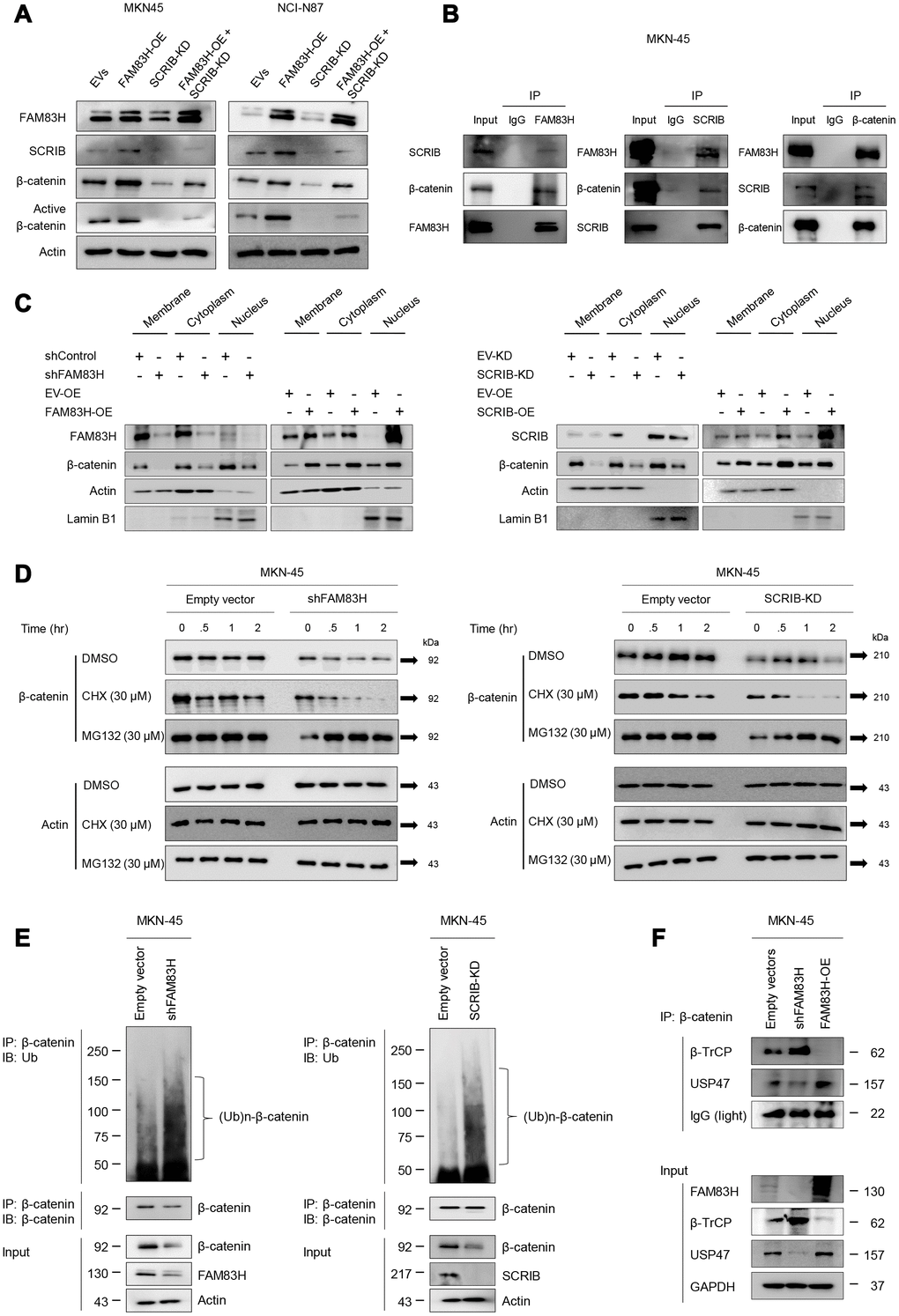 MKN-45 gastric cancer cells were transfected with empty vector, shRNA for FAM83H, or hSCRIB CRISPR/Cas9 KO plasmid. After 24 hours post-transfection, the cells were treated with 30 μM cycloheximide (CHX; Sigma, St. Louis, MO) or 30 μM MG132 (Sigma, St. Louis, MO) for 30 minutes to two hours. Western blotting for β-catenin (BD Biosciences, San Jose, CA) and actin (Santa Cruz Biotechnology, Santa Cruz, CA) was performed on whole protein lysates. In addition, to evaluate the ubiquitination of β-catenin with knock-down of FAM83H or SCRIB, western blotting with anti-ubiquitin antibody after immunoprecipitation with anti-β-catenin antibody was performed. For this evaluation, MKN-45 cells were transfected with empty vector, shRNA for FAM83H, or hSCRIB CRISPR/Cas9 KO plasmid, and the cells were treated with 30 μM MG132 for two hours. The total cell lysates were immunoprecipitated with anti-β-catenin antibodies and blotted with anti-Ubiquitin antibody (Santa Cruz Biotechnology, Santa Cruz, CA).