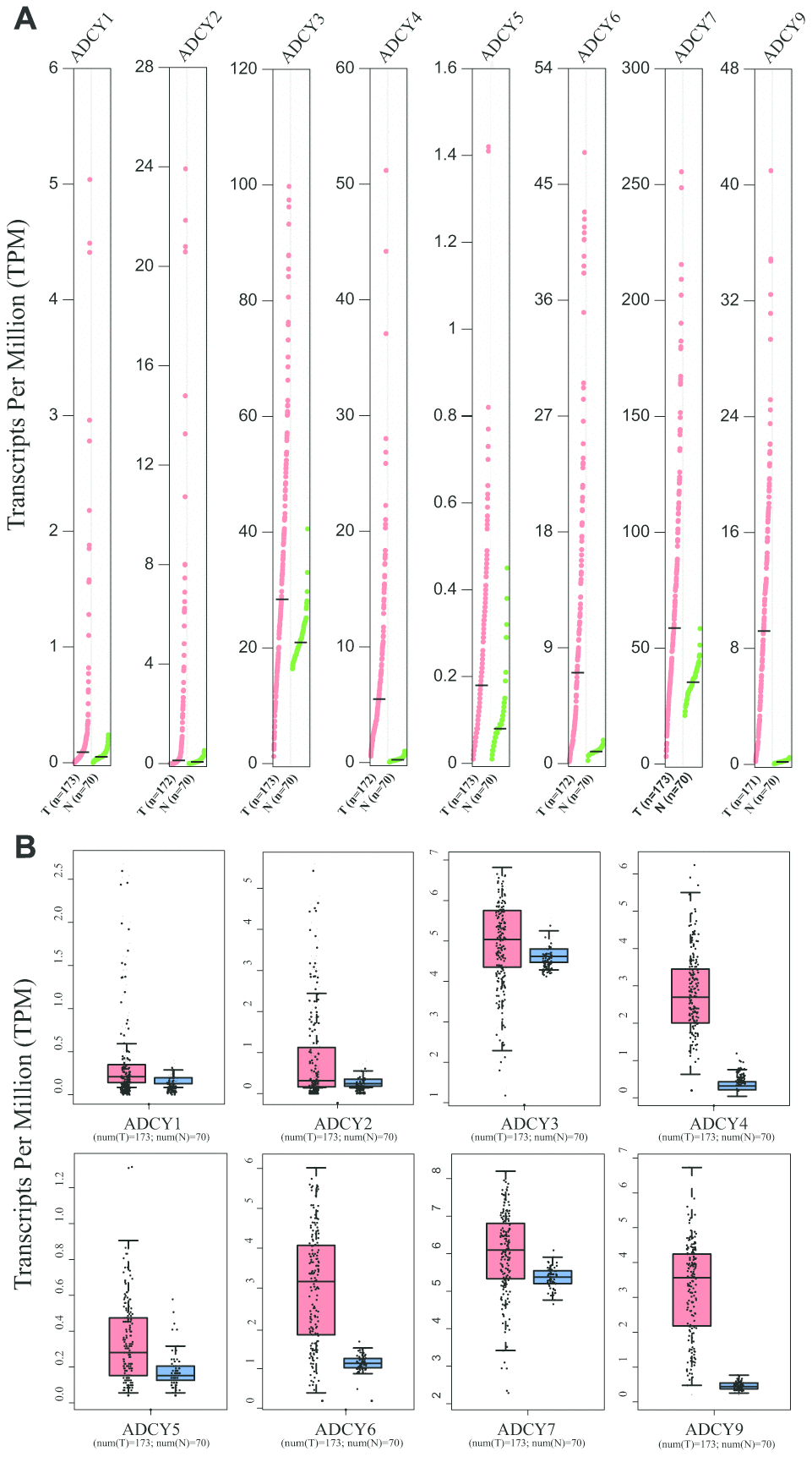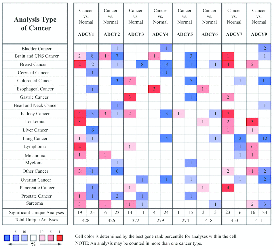 The Oncomine website (https://www.oncomine.org/re-source/login.html) was utilized to obtain ADCY gene expression data from cancer and control samples. ADCY expression was compared between clinical cancer specimens and paired normal controls using Student’s t test.