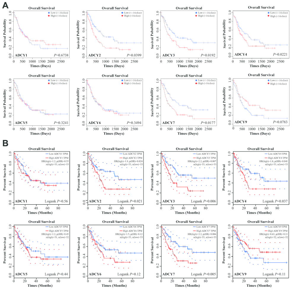 Figure 3. Significance of ADCYs in predicting the prognosis for AML patients. (A) The prognostic values of ADCYs in LinkedOmics datasets. (B) The prognostic values of ADCYs in GEPIA.