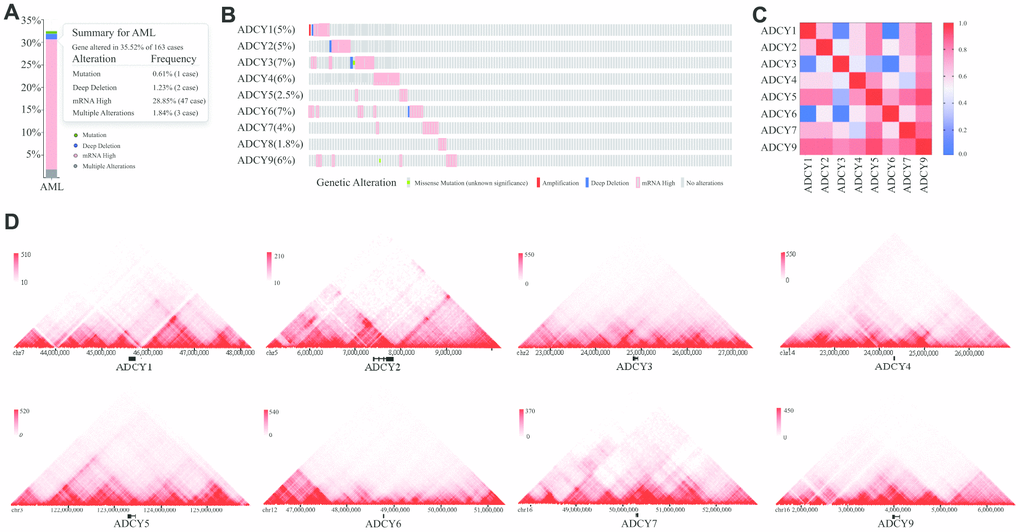 Figure 4. Visual summary of ADCY alterations. (A) Summary of ADCY alterations in AML (cBioPortal). (B) Details of ADCY alterations in AML (cBioPortal). (C) Gene relevance analysis among the ADCY family. (D) 3D genome of ADCYs in THP1 cells.