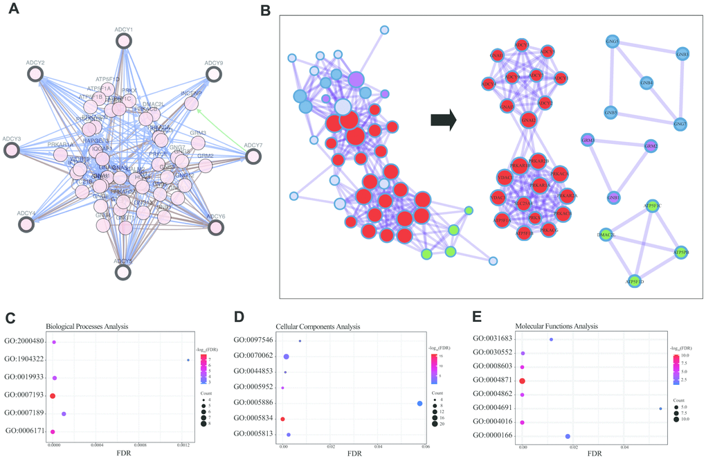 Figure 5. Enrichment analysis of ADCY FANGs in AML patients. (A) Network for ADCYs and the top 58 FANGs (cBioPortal). (B) Detailed net-structure of ADCY proteins in AML (Metascape). Bubble diagrams showing the top 58 FANGs in AML. (C) Biological processes. (D) Cellular components. (E) Molecular functions.