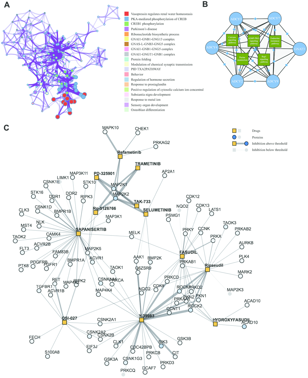 Figure 6. KEGG Enrichment and therapeutic targets of ADCYs in AML. (A) Significant terms among the gene memberships (Metascape). (B) KEGG analysis of FANGs in AML. (C) Protein-drug interaction map for inhibitors of the MAPK pathway in AML.