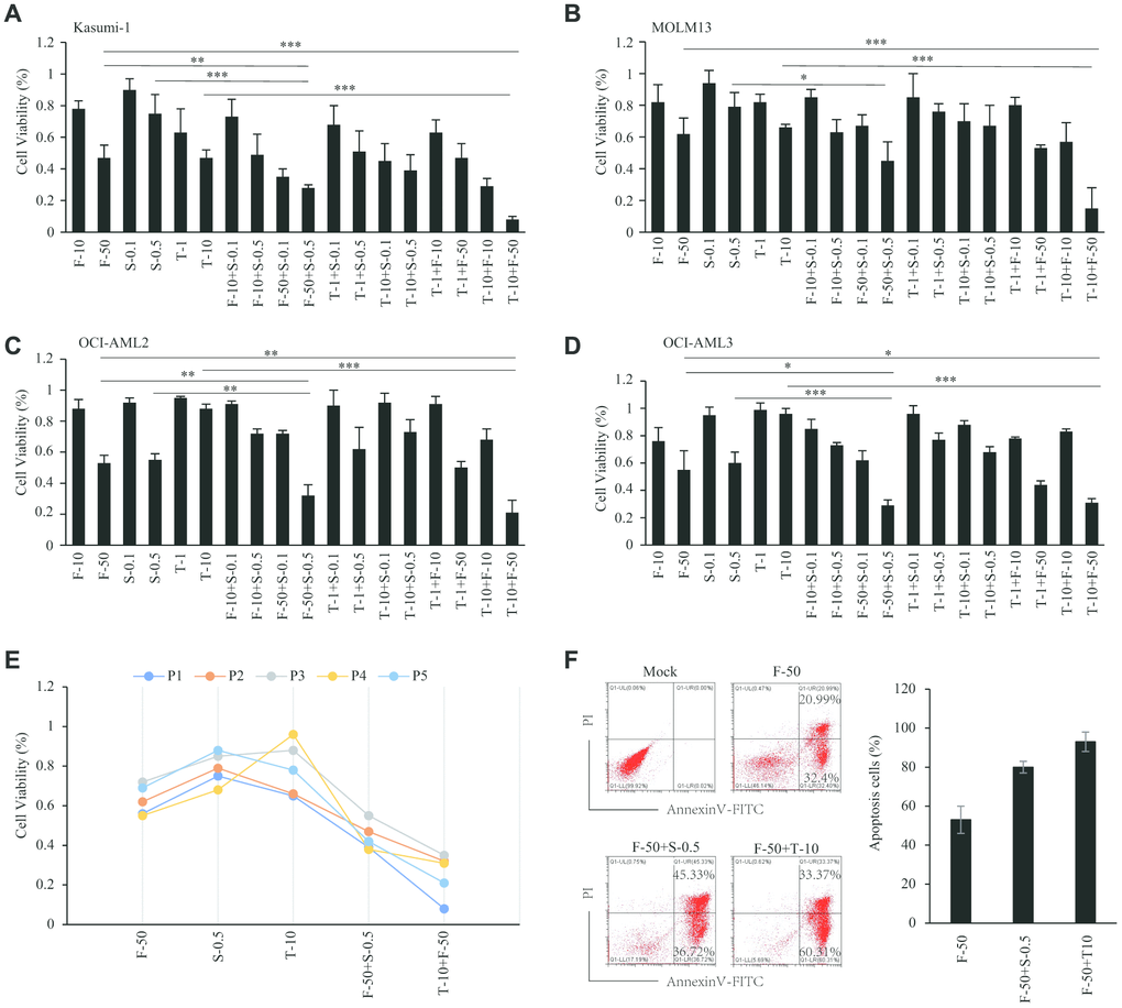 Figure 7. Sensitivity effect of inhibitors in AML. (A–D) Sensitivity effect of fasudil, trametinib and sapanisertib in AML cell lines of Kasumi-1 (A), MOLM13 (B), OCI-AML2 (C) and OCI-AML3 (D). (E) Sensitivity effect of inhibitors in AML patient samples. (F) Apoptosis induced by inhibitors among AML patient cells.