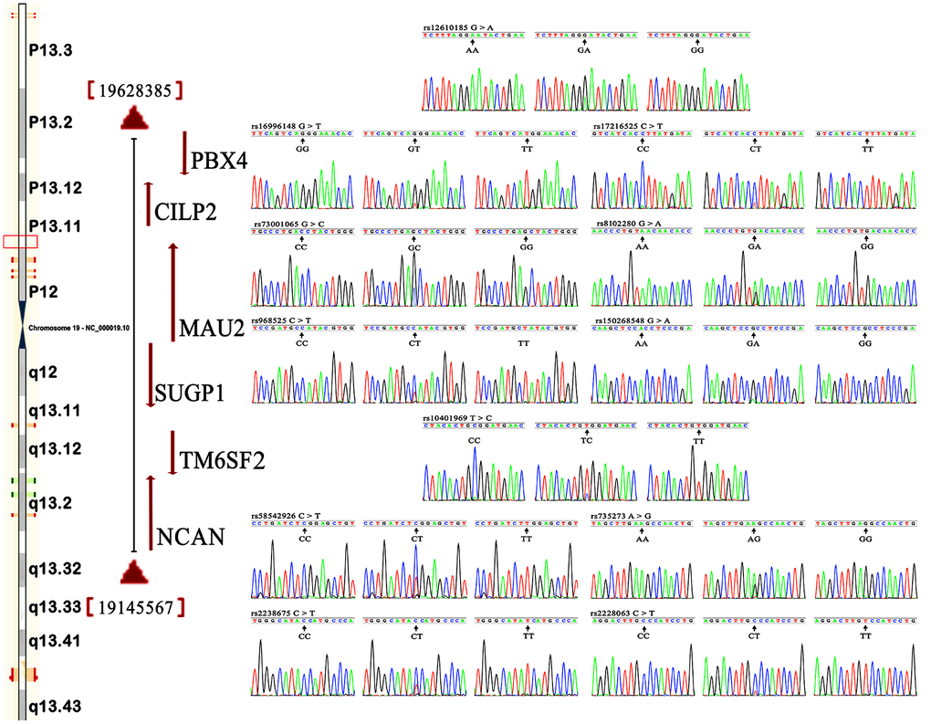 Figure 1. Locations and partial nucleotide sequences of the NCAN, TM6SF2, CILP2, PBX4, SUGP1 and MAU2 SNPs.NCAN, the neurocan gene; TM6SF2, the transmembrane 6 superfamily member 2 gene; CILP2, the cartilage intermediate layer protein 2 gene; PBX4, the PBX homeobox 4 gene; SUGP1, the SURP and G-patch domain containing 1 gene; MAU2, the MAU2 sister chromatid cohesion factor gene.