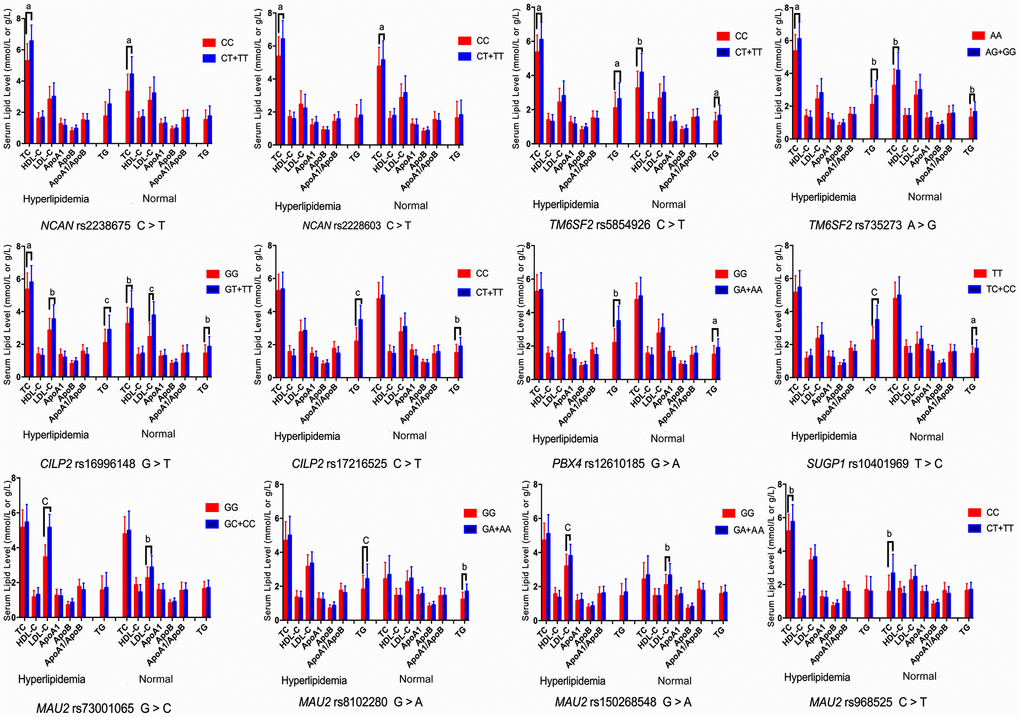 The current study has several limitations. First, the sample size is comparatively small. Thus, additional studies with large sample sizes are necessary. Second, lower numbers of individuals are obtainable for minor allele frequency (MAF) of certain variants, and it is relatively weak in calculating a strong power. Third, numerous unmeasured environmental and genetic factors must be determined, such as dietary patterns, physical exercises, and energy intake. Finally, we should define the relevance of this finding with a high criterion in further studies, including incorporating the genetic information of the NCAN, TM6SF2, CILP2, PBX4, SUGP1 and MAU2 single nucleotide mutations, haplotypes, interactions of G × G and G × E from in vivo to in vitro, and testing the effect of genetic variants with different molecular biological levels, such as genetic transcription and expression.