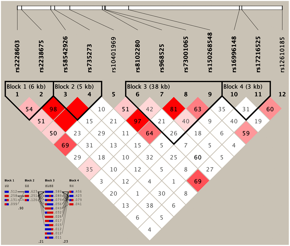 Twelve SNPs in the NCAN, TM6SF2, CILP2, PBX4, SUGP1 and MAU2 were selected as follows: (1) NCAN, which was associated with serum lipid levels, was selected from a previous GWAS. The gene clusters of TM6SF2-CILP2-PBX4-SUGP1-MAU2 were closely associated with lipid metabolism and NCAN. (2) Information regarding Tagging SNPs, functional SNPs, and predicted SNPs can be found in our previous article [23]. (3) SNP information was obtained from NCBI dbSNP Build 132 (http://www.ncbi.nlm.nih.gov/SNP/), which can be found in Supplementary Table 1. The MAF was restricted to greater than 1% in SNPs. (4) There might be some association between those SNPs and serum lipid levels or cardio cerebral vascular diseases in previous studies. (5) NCAN rs2238675-rs2228603, TM6SF2 rs58542926-rs735273, CILP2 rs16996148-rs17216525, PBX4-SUGP1 rs12610185-rs10401969, and MAU2 rs73001065-rs8102280-rs150268548-rs968525 were chosen by the block-based method. This strategy is facilitated by the associations among tagging SNPs and is demonstrated as LD (D′ > 0.7).
