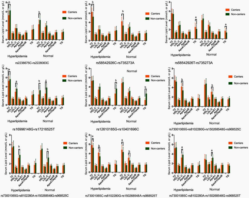 Cardiovascular diseases (CVDs) have been a notable cause of disability and death worldwide. Numerous epidemiological, clinical and experimental studies have demonstrated that hyperlipidemia is involved in the progression of atherosclerosis which, in turn, causes CVD. Hyperlipidemia has a vital function in the onset of atherosclerosis; it can lead to oxidative stress and chronic inflammation and induce damage to macromolecules, endothelial cell apoptosis, proliferation and migration of vascular smooth muscle cells, all of which involve the formation of atheroma, leading to the development of atherosclerosis [1]. Although people strive to change their lifestyle and take such medications as statins and other lipid-lowering drugs, the incidence of CVD is still increasing [2]. It is difficult for many individuals to reach standard serum lipid levels even after taking medications, or some of them may suffer from certain side effects [3]. Thus, it is essential to discover variants for new markers that regulate serum lipid profiles, which may facilitate efforts to further improve hyperlipidemia and thus may reduce the probability of CVD.