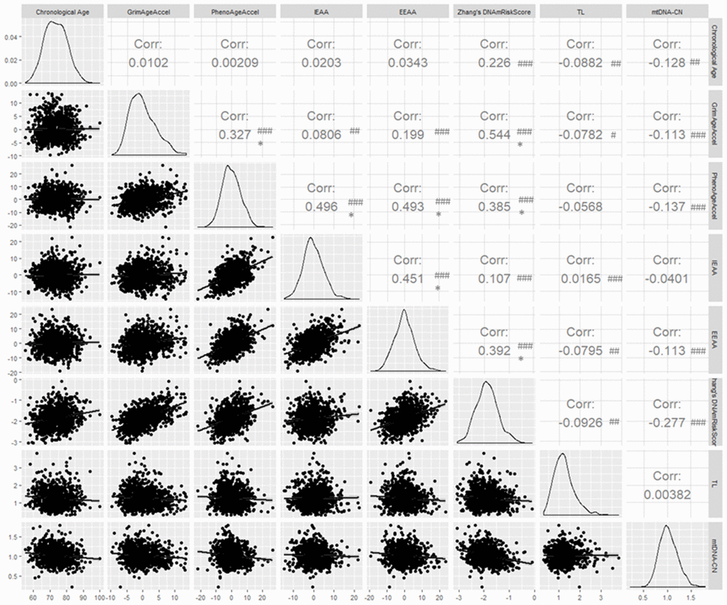We calculated pairwise correlations between chronological age and the seven BoA (Figure 1). According to Hung et al. [29], only correlation coefficient (r) 0.30 should be considered as "clinically significant" when P < 0.05. In this study, chronological age was not clinically associated with seven BoAs, while it was statistically significantly correlated with Zhang’s DNAmRiskScore (correlation coefficient ® = 0.23; P ≤ 0.001), TL (r = -0.09; P ≤ 0.01), and mtDNA-CN (r = -0.13; P ≤ 0.01). GrimAgeAccel was clinically associated with PhenoAgeAccel (r = 0.33; P ≤ 0.001) and Zhang’s DNAmRiskScore (r = 0.54; P ≤ 0.001). IEAA and EEAA were also highly correlated with each other (r = 0.45; P ≤ 0.001). TL and MtDNA-CN was not clinically associated with other BoAs. We also computed pairwise correlations between chronological age and four types of epigenetic ages. All of them were highly correlated with each other (Supplementary Figure 5). For epidemiologic purposes, non-clinically significant associations may still represent important associations.