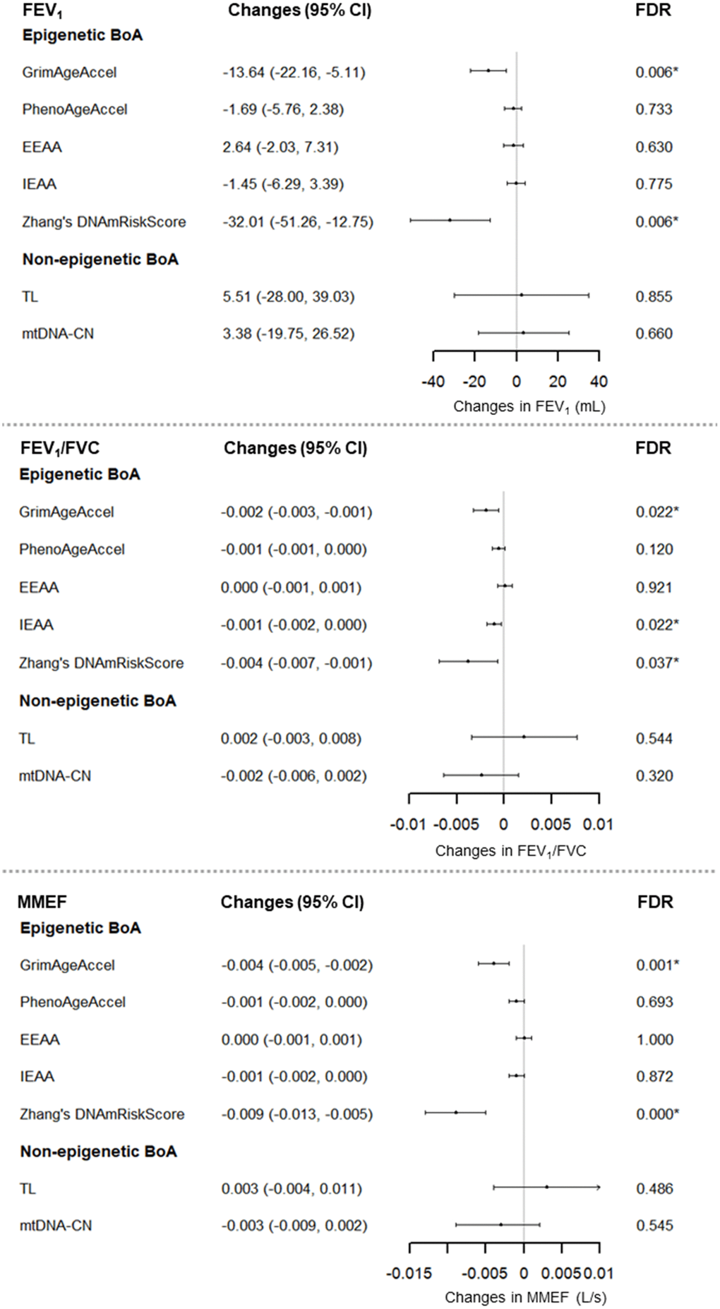Figure 2 shows the results of the primary analyses. FEV1, FEV1/FVC and MMEF was significantly negatively associated with each of GrimAgeAccel and Zhang’s DNAmRiskScore. For example, each increment of one year in GrimAgeAccel was associated with a decrease in FEV1 of 13.64 mL (95% CI: -22.16 to -5.11; FDRB-H = 0.006), in FEV1/FVC of 0.002 (95% CI: -0.003 to -0.001; FDRB-H = 0.022), and in MMEF of 0.004 L/s (95% CI: -0.005 to -0.002; FDRB-H < 0.001). In addition, a 0.2 increase in Zhang’s DNAmRiskScore was associated with a decrease in FEV1 of 32.01 mL (95% CI: -51.26 to -12.75; FDRB-H = 0.006), in FEV1/FVC of 0.004 (95% CI: -0.007 to -0.001; FDRB-H = 0.037), and in MMEF of 0.009 L/s (95% CI: -0.013 to -0.005; FDRB-H < 0.001). IEAA was related to lower FEV1/FVC. No association was found between lung function and non-epigenetic BoA.