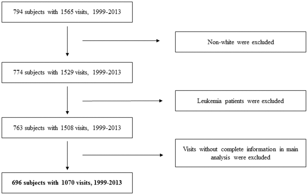 We narrowed down our analyses to visits with DNA samples, which were collected from 1999 to 2013 [46]. To reduce study heterogeneity, those who were non-white (3%) were excluded. Subjects with a diagnosis of leukemia (n=11) were also be removed, due to its potential influence on DNAm [19]. This study was approved by the Institutional Review boards of the Department of Veterans Affairs and the Harvard TH Chan School of Public Health. All participants provided their written informed consent. The flowchart of our study participants is shown in Figure 3.