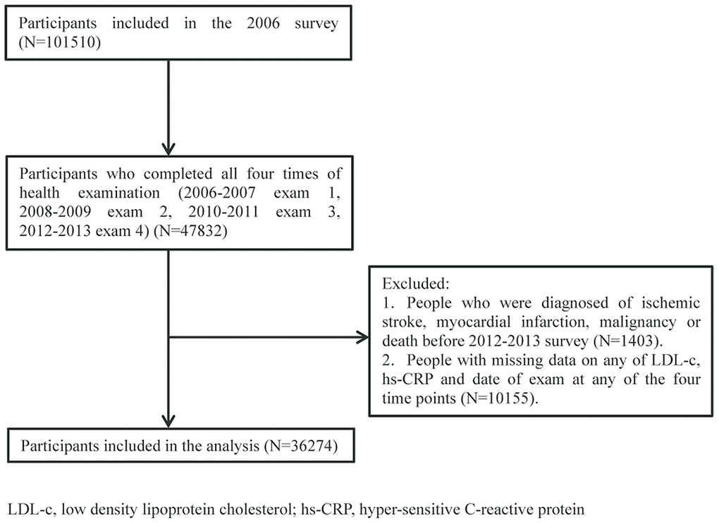 To help address the above questions, we utilized a longitudinal cohort from the Kailuan Study to investigate the impact of cumulative hs-CRP burden on cardiovascular events without the presence of cumLDL-c.