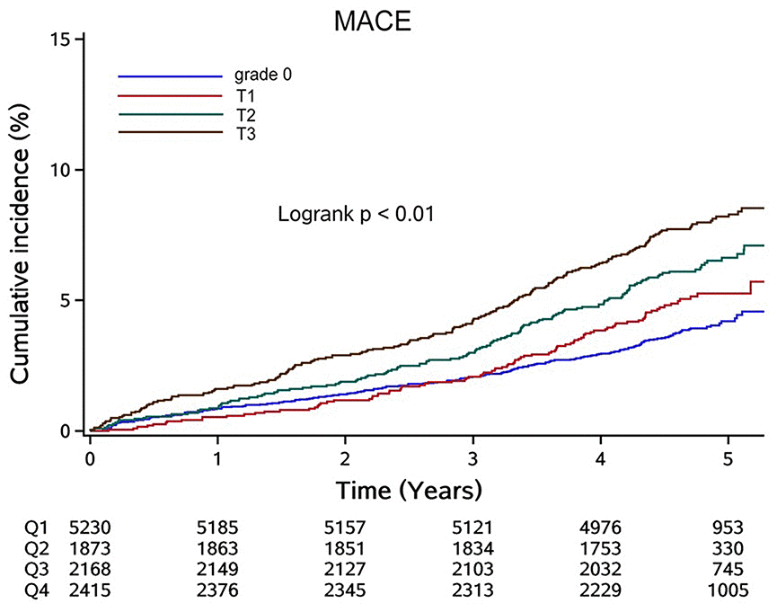 We also conducted a sensitivity analysis of the population with cumLDL-c = 0. Figure 3 illustrates the Kaplan–Meier curves for MACE based on cumhs-CRP level. Participants with cumhs-CRP = 0 were designated grade 0 and the remaining participants designated either T1, T2, or T3 using cumhs-CRP tertiles. Although the overall incidence rate was low, there was a progressive increase in MACE rate with increasing cumhs-CRP tertile.