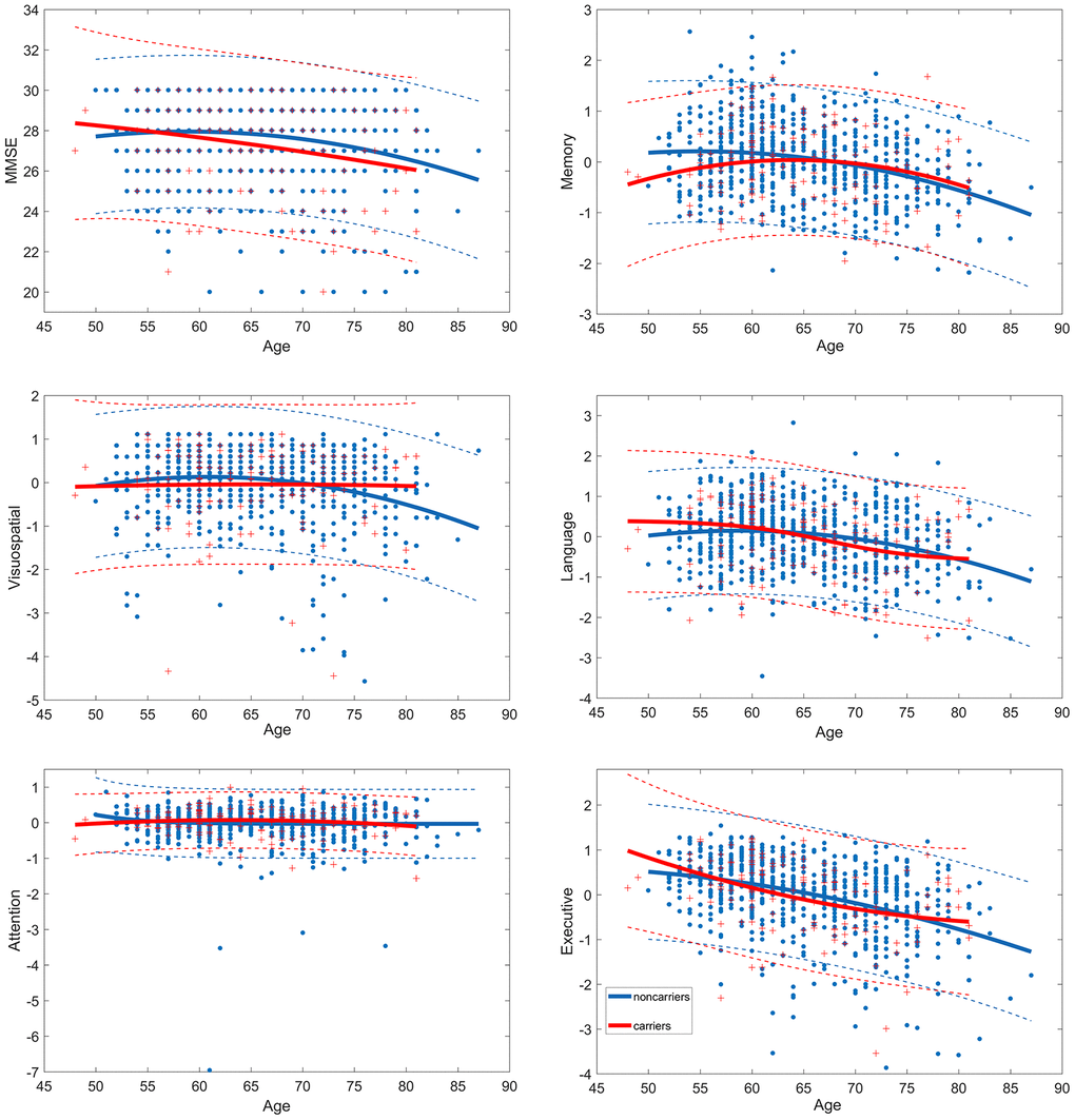 We assessed the APOE ε4 genotype × age interaction on each cognitive domain (raw MMSE score or composite cognitive domain scores). Specifically, a GLM with “age”, “APOE ε4” and “APOE ε4 × age” as predictor variables were applied, in which gender and education were included as covariates. Curvilinear regression models were used to assess associations between cognitive functions and age in the APOE ε4 carriers and noncarriers respectively. We use linear, quadratic, or sigmoidal regression curve to fit different cognitive functions and judge from the goodness of fit to data (R2).